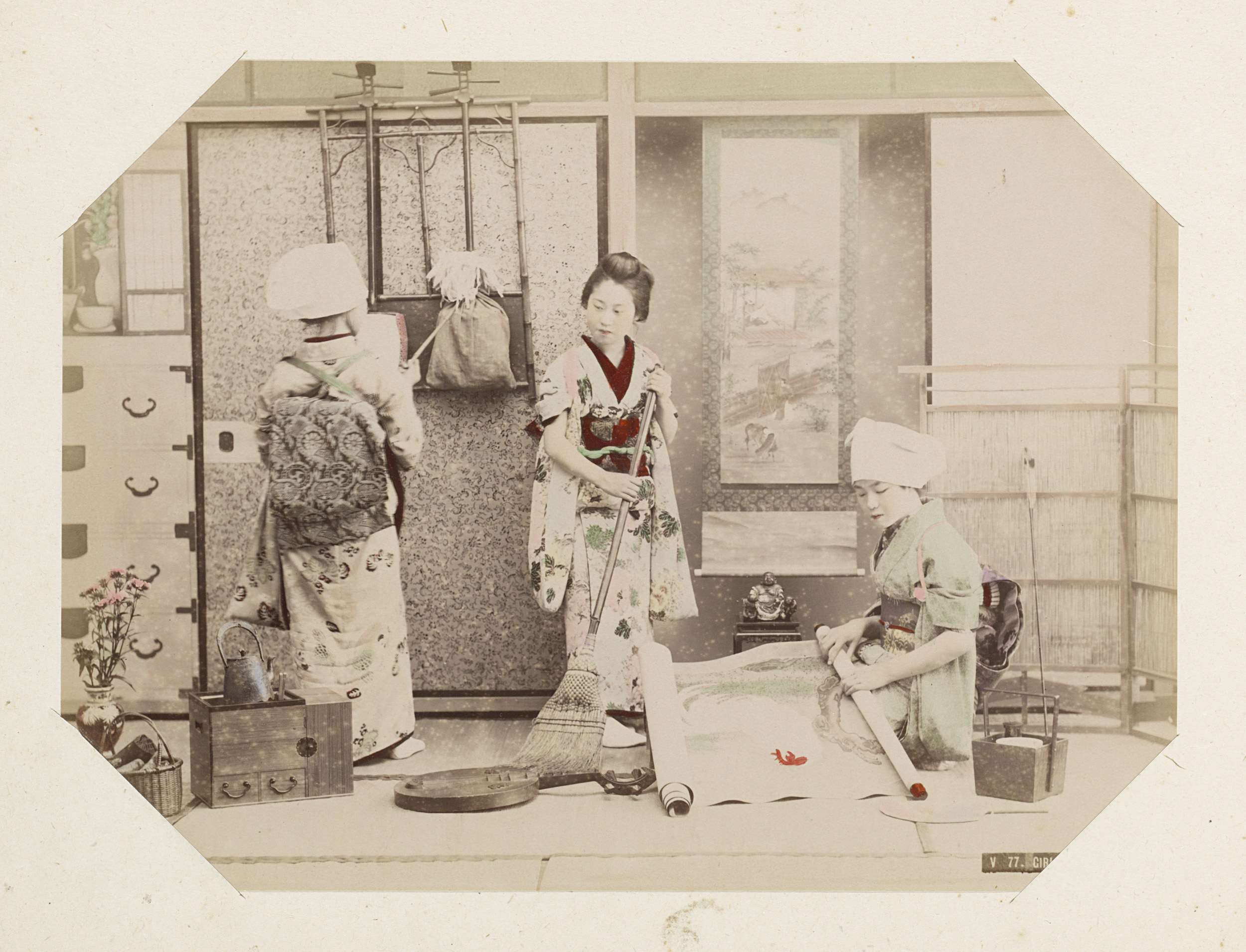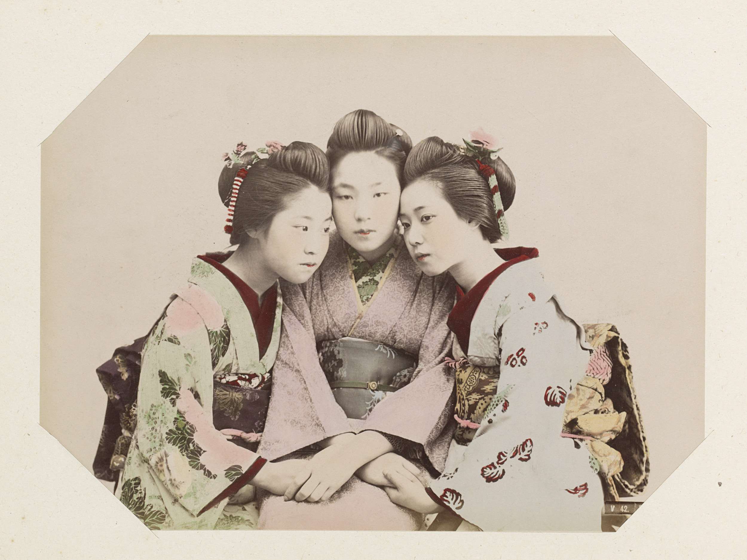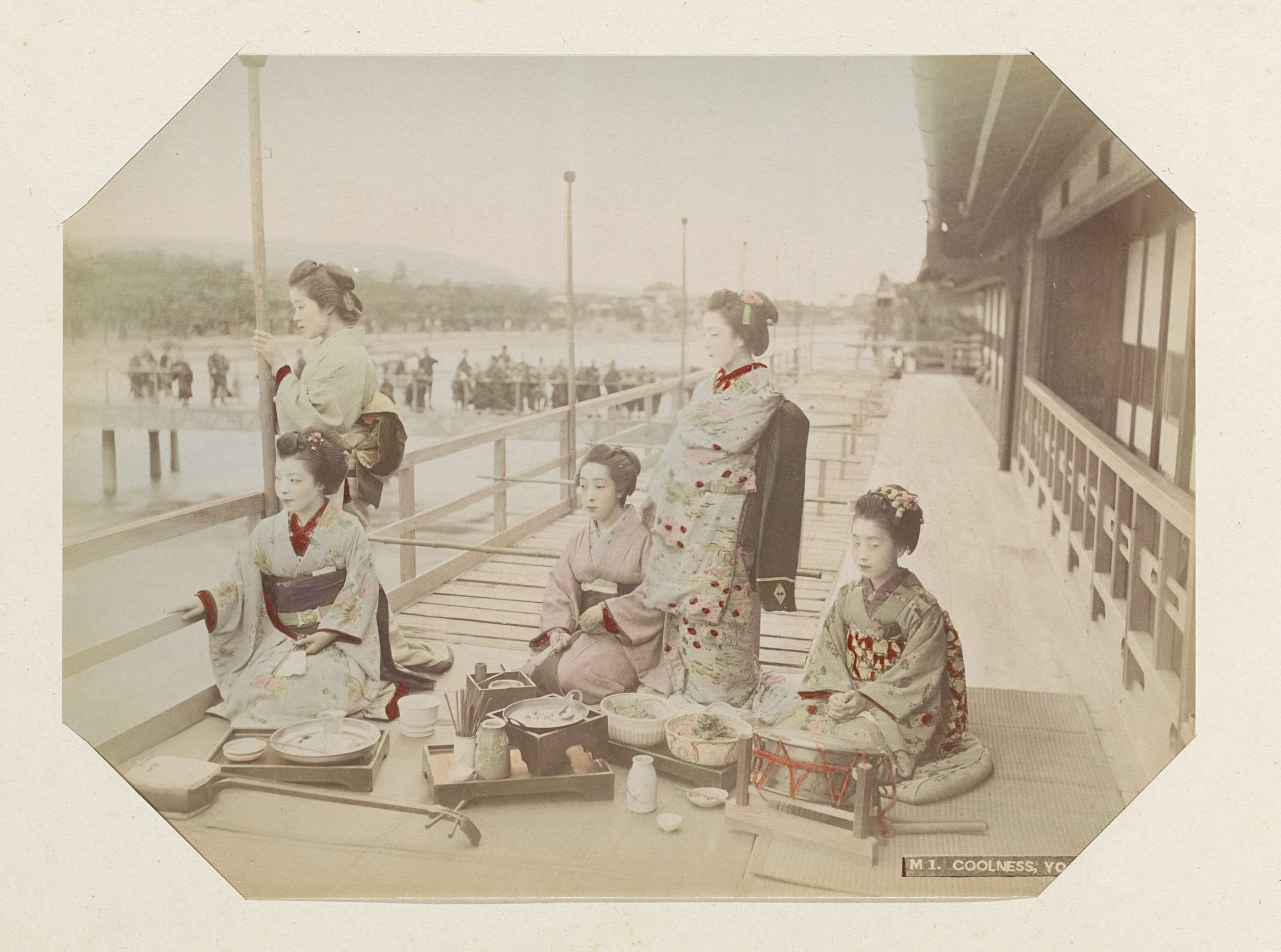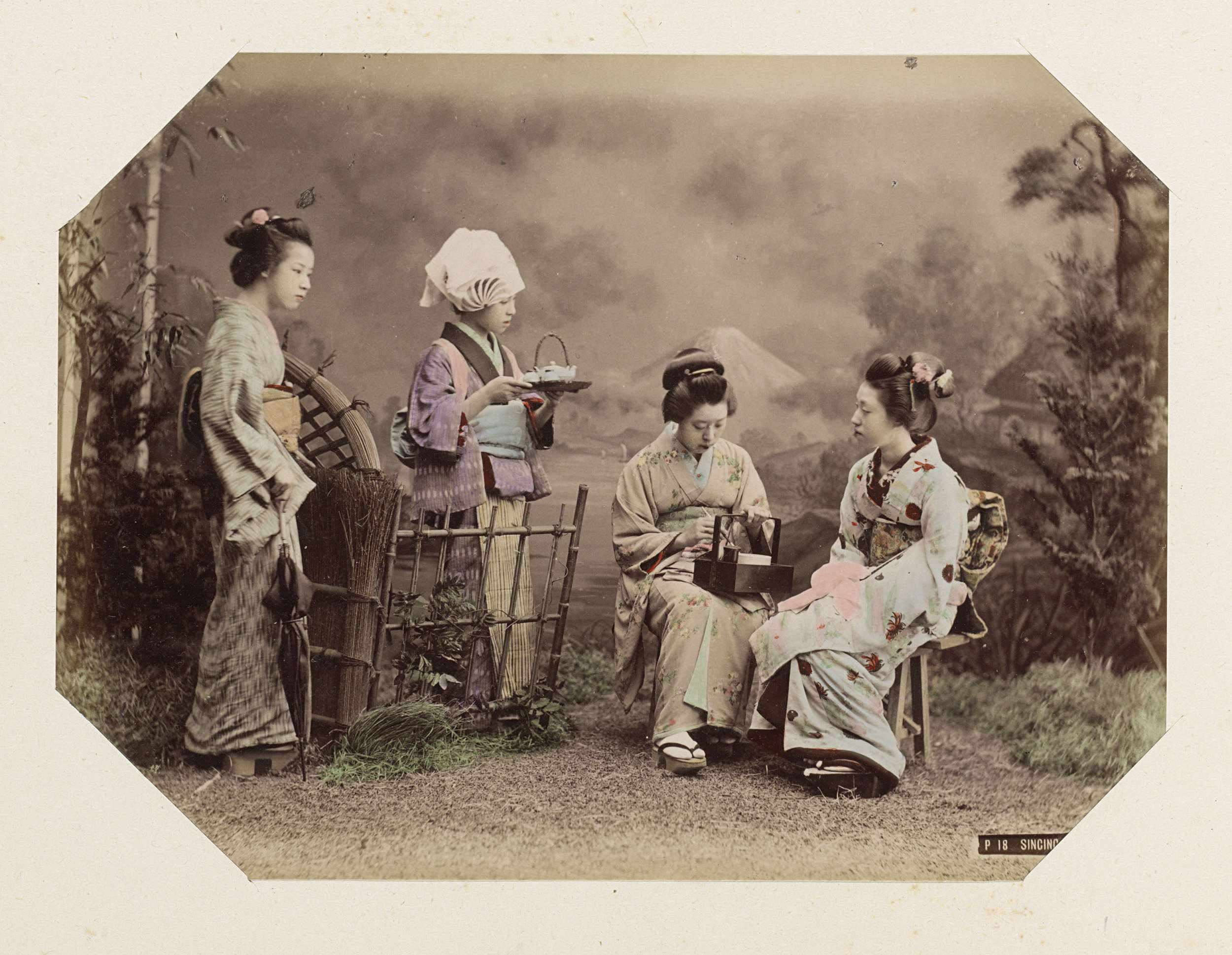 Drie Japanse vrouwen bij een theehuis in het Suwapar...