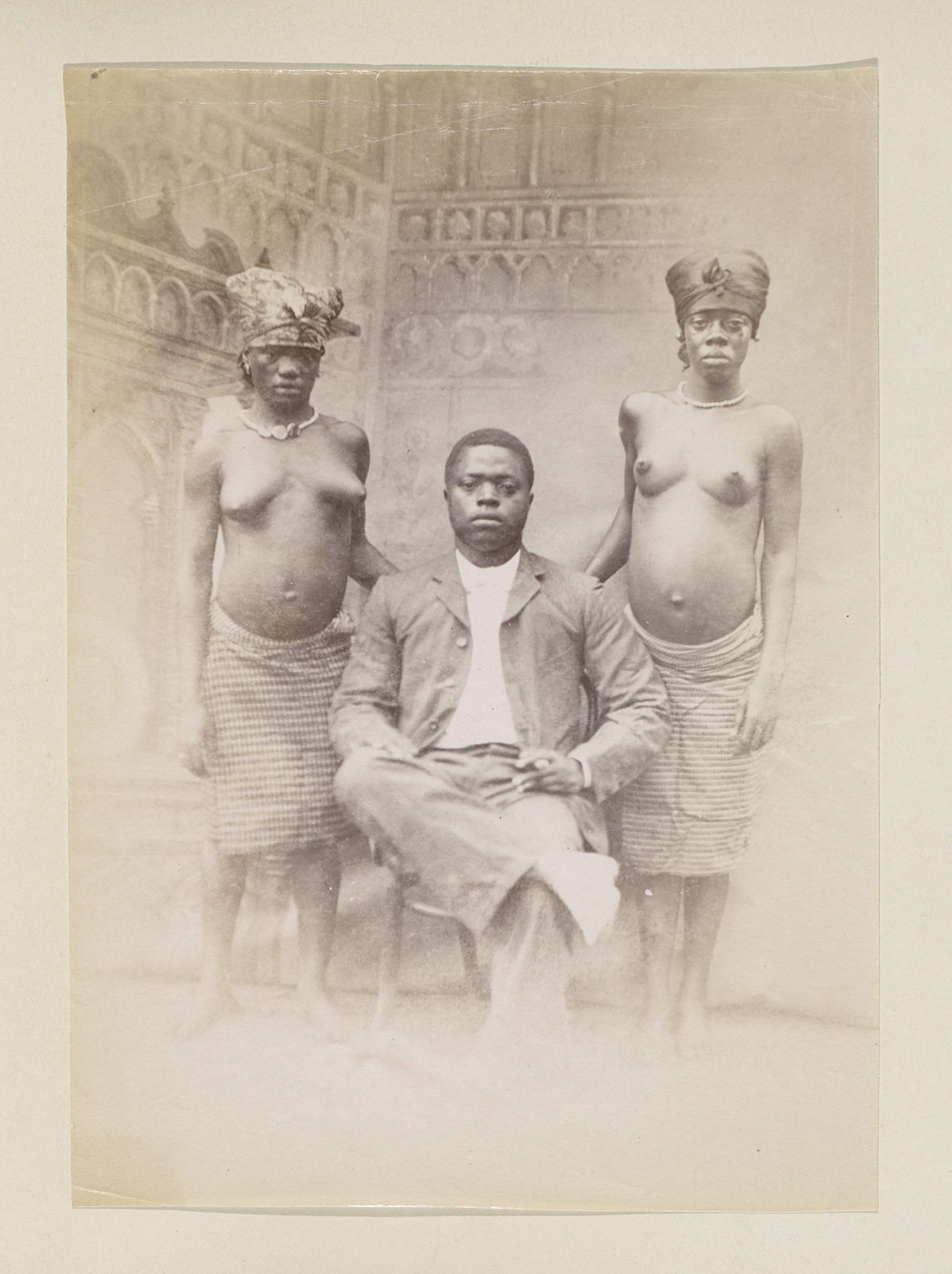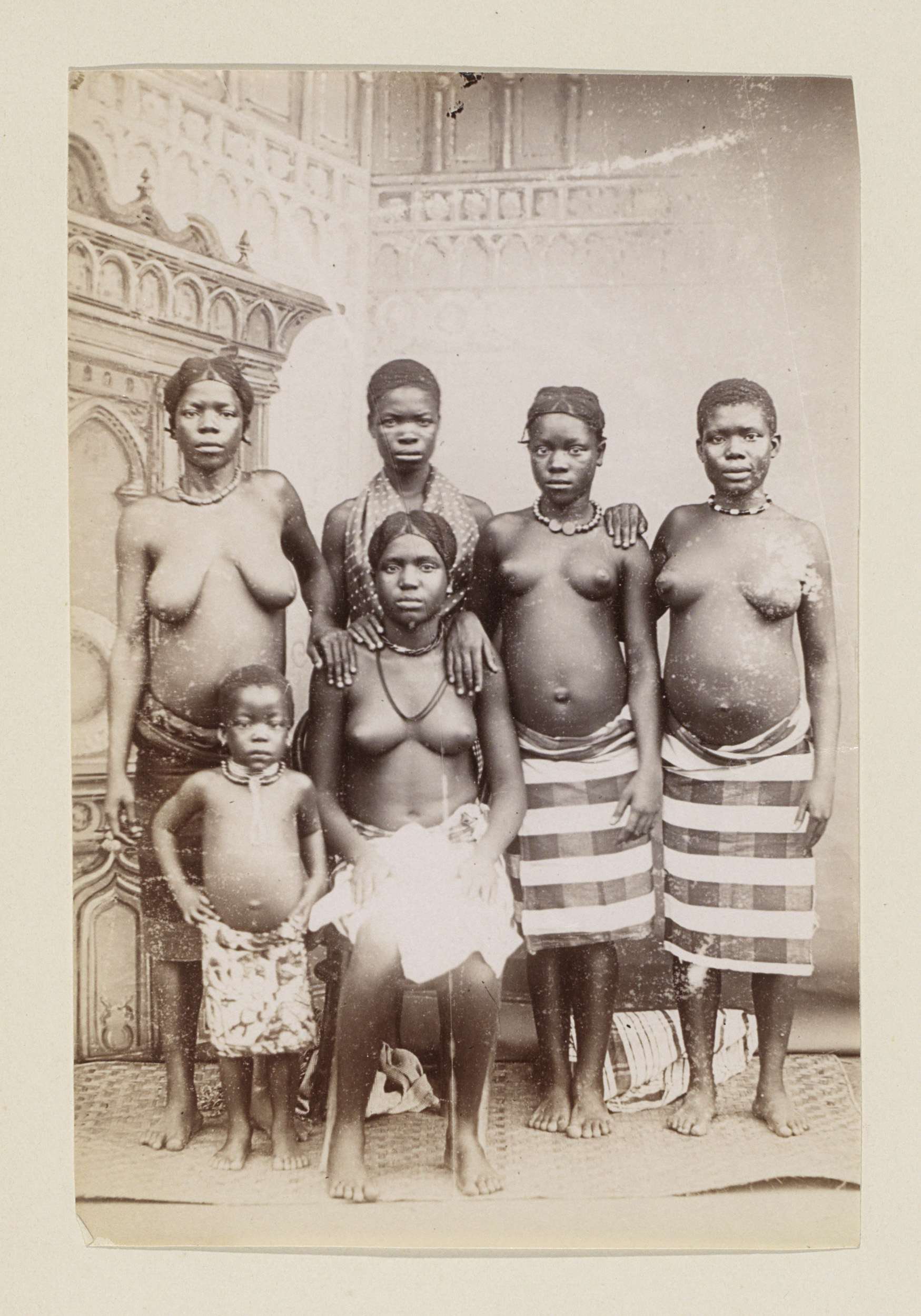 Studioportret van vijf halfnaakte Afrikaanse vrouwen...