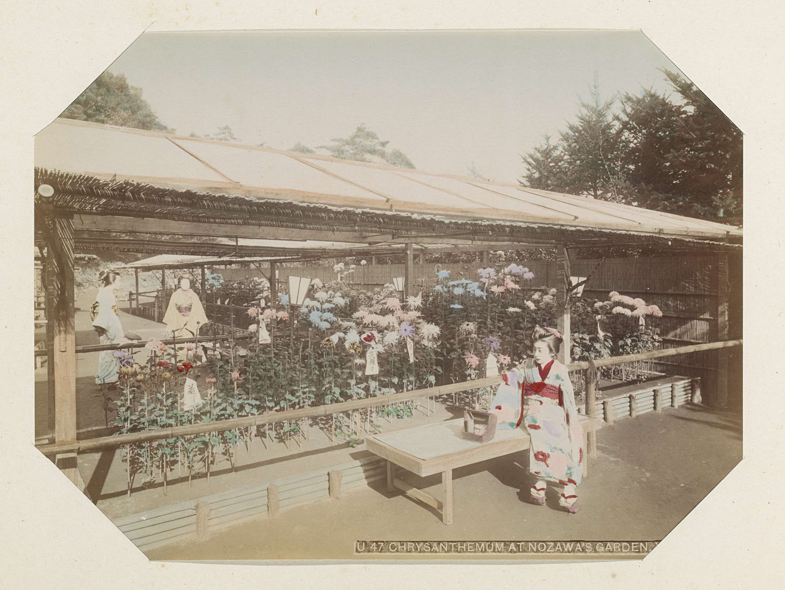 Kraam met chrysanten en verkoopster in de Onzawatuin...