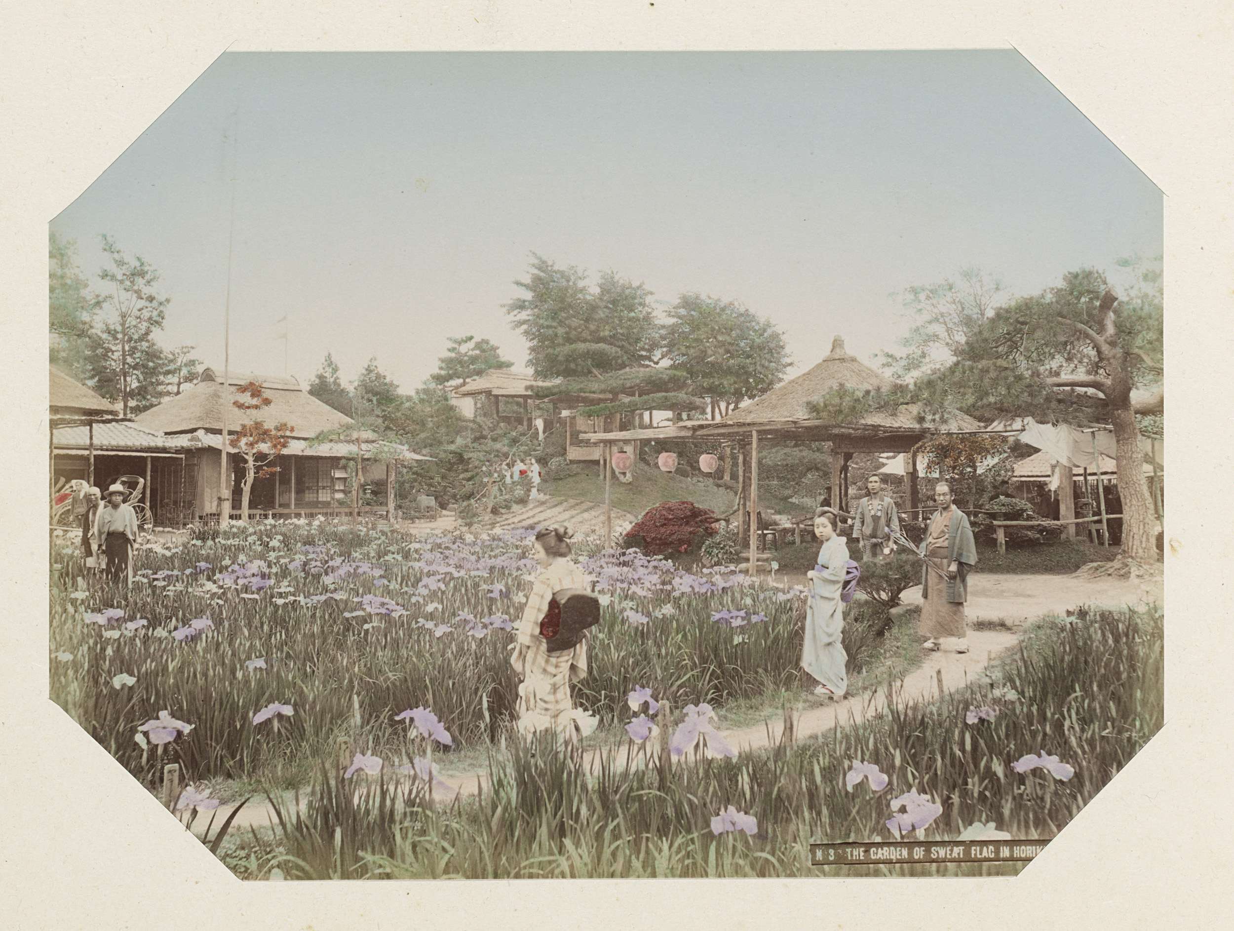 Tuin met bloemen en bezoekers in Horikiri bij Tokyo