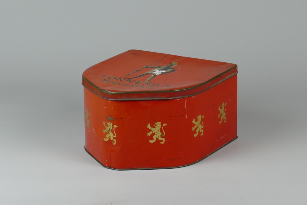 Trommel van blik met opdruk in rood, zwart en goudkl...