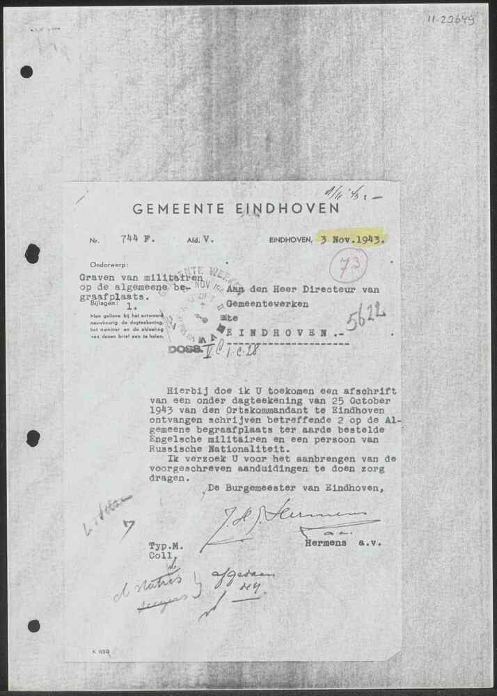 Rapport Nr. 744 Gemeente Eindhoven, 3 november 1943.