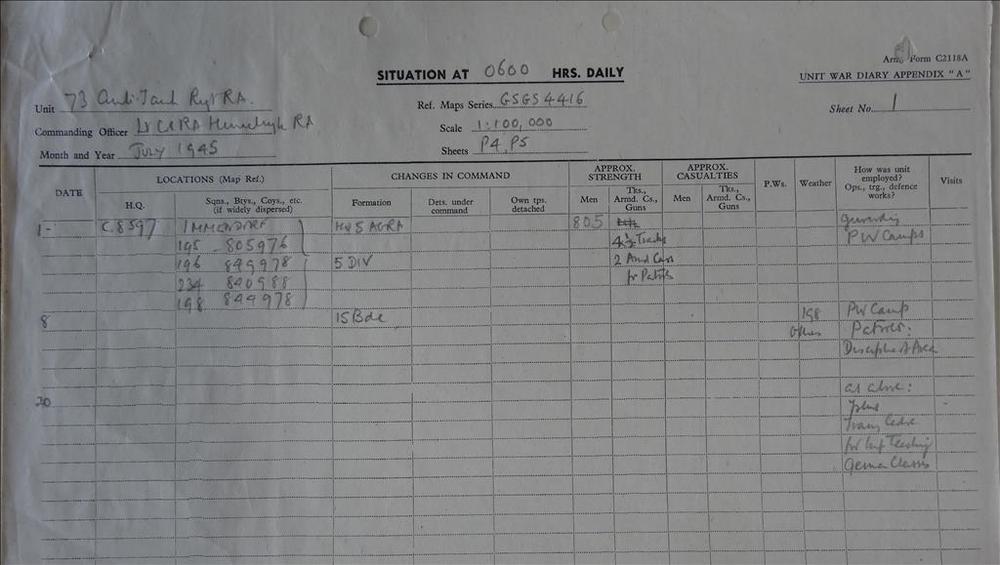 War Diary 73rd Anti Tank Regiment RA, juli 1945