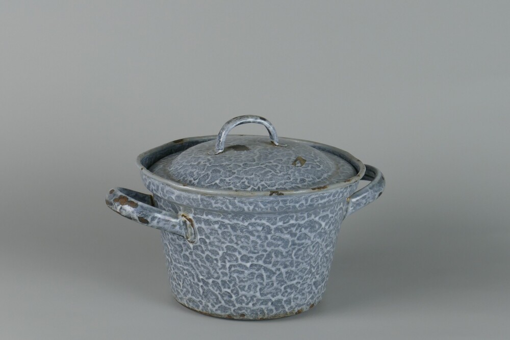 pan met deksel, gemaakt van grijs gewolkt geëmaillee...