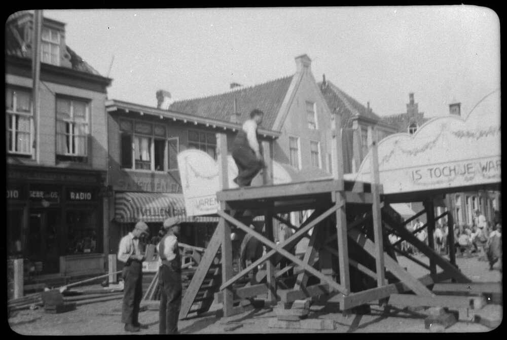 Foto, voorstellende de opbouw van de kermis, vervaar...