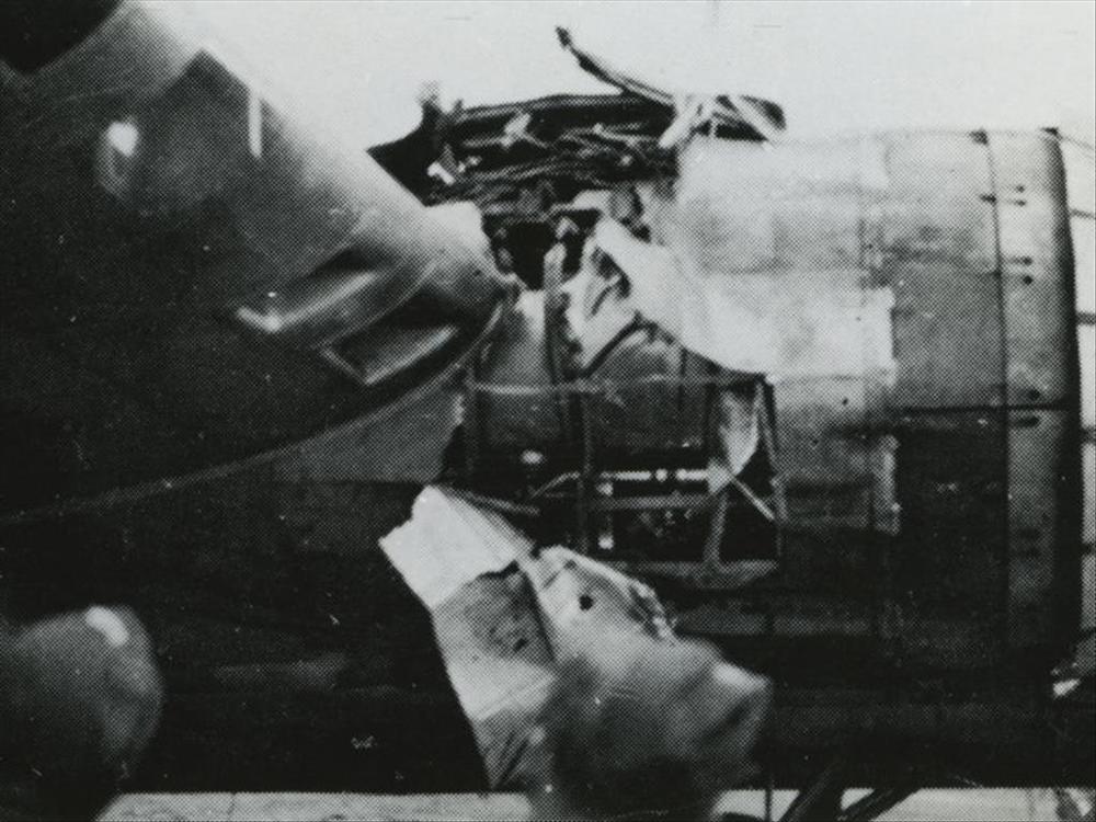 Foto van beschadigde vliegtuigmotor.
