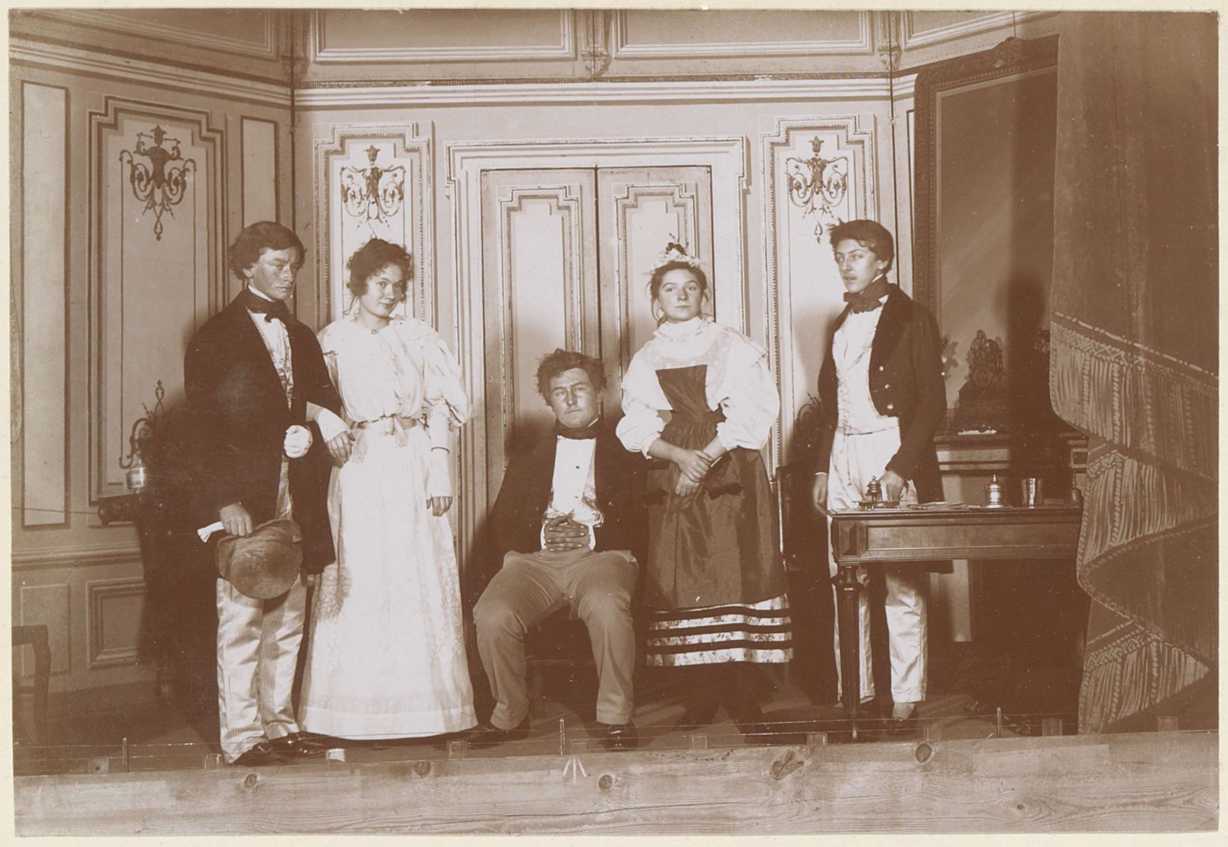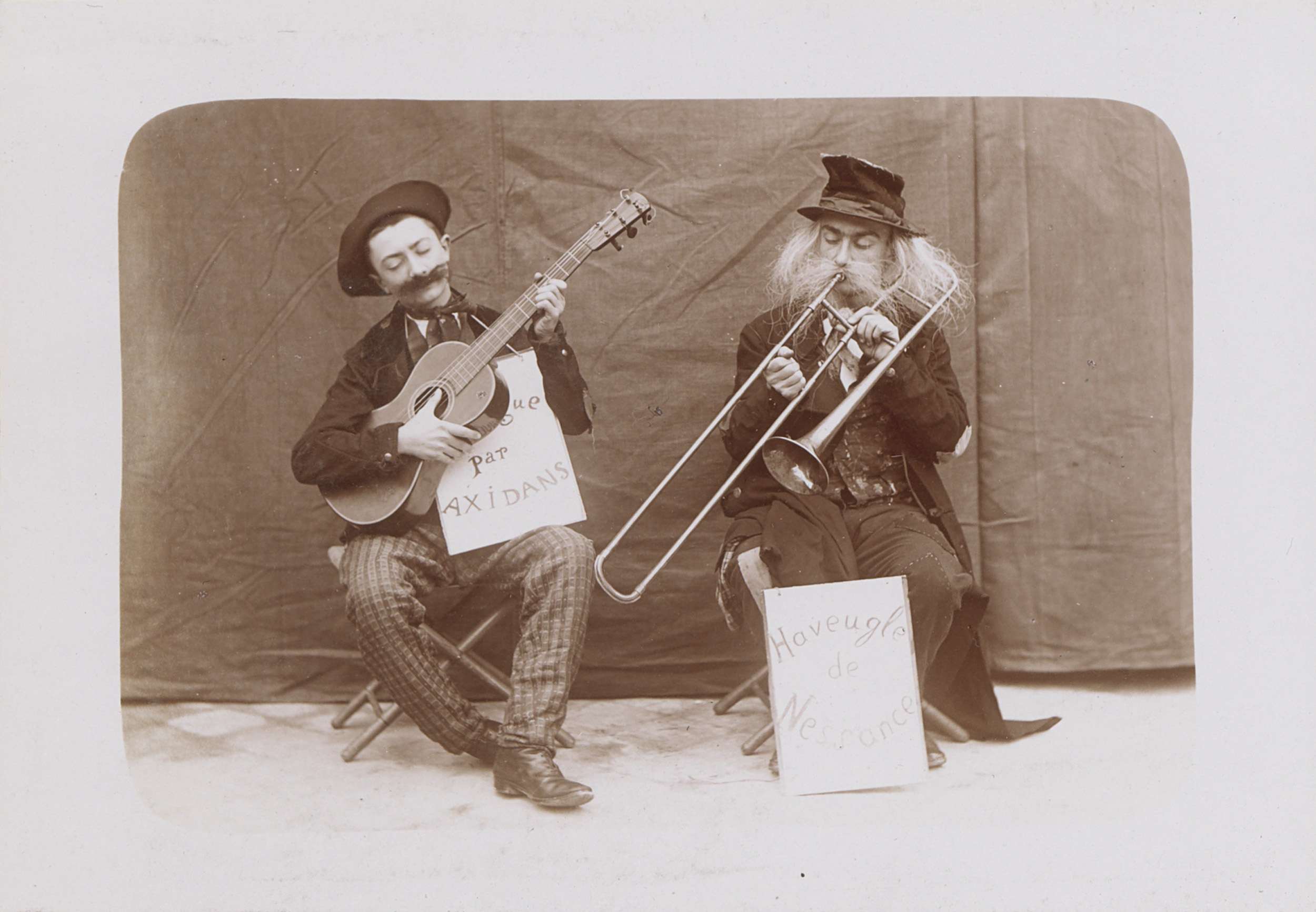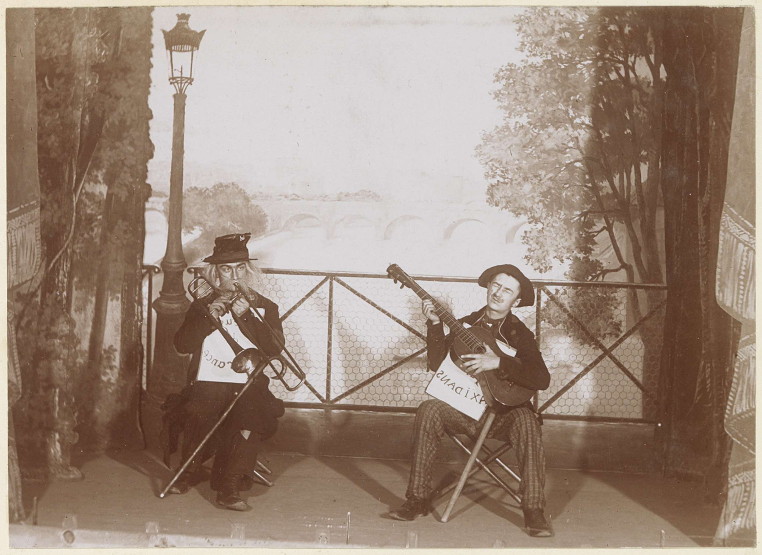 Twee muzikanten op een toneel, vermoedelijk Franse a...