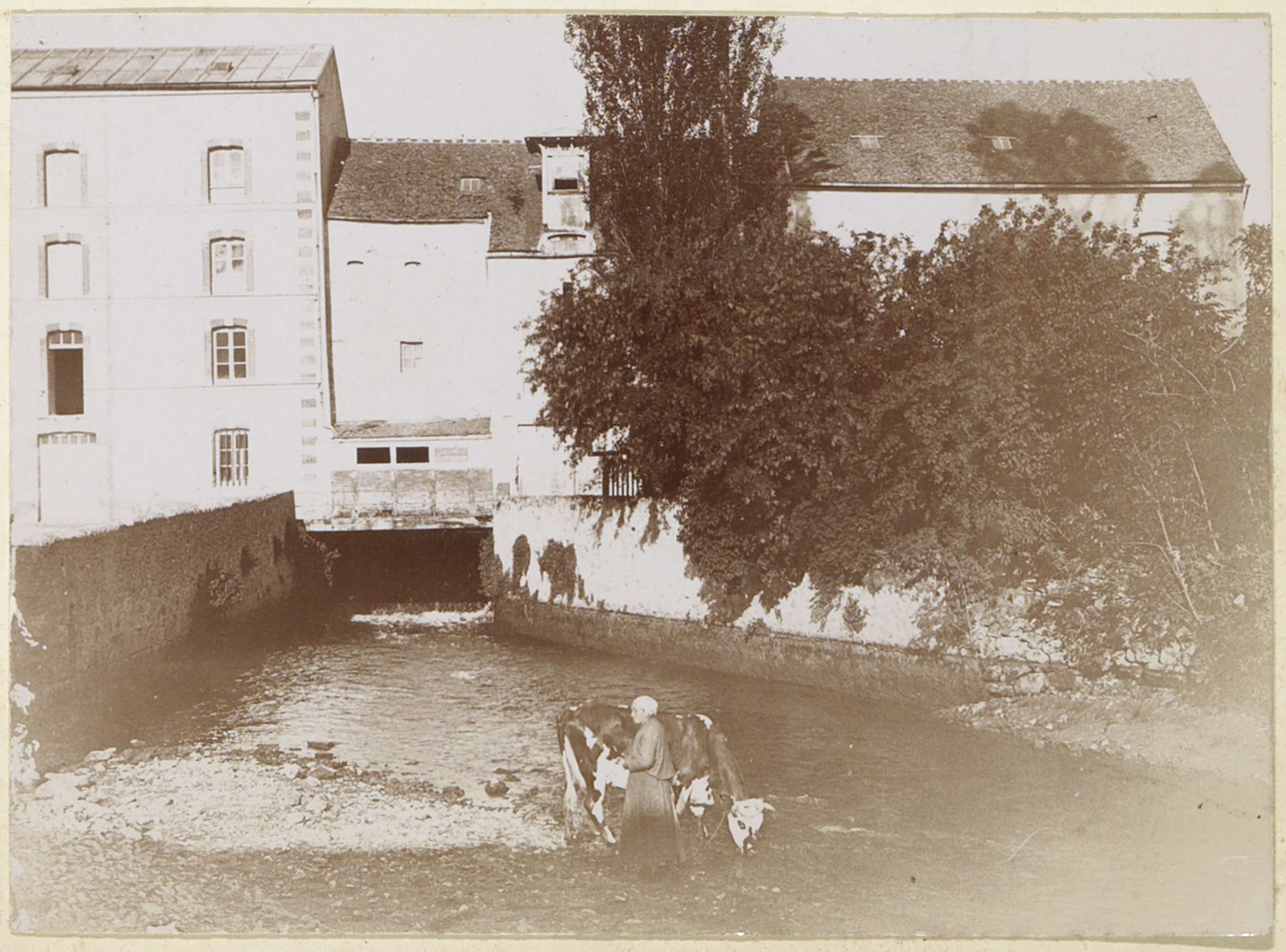 Huis met beek eronder in Frankrijk, op de voorgrond ...
