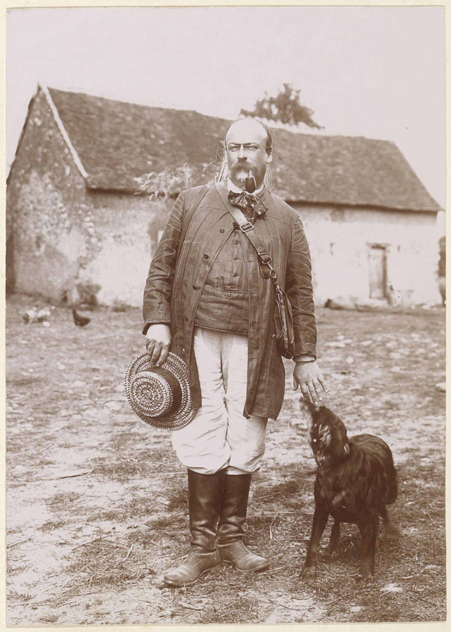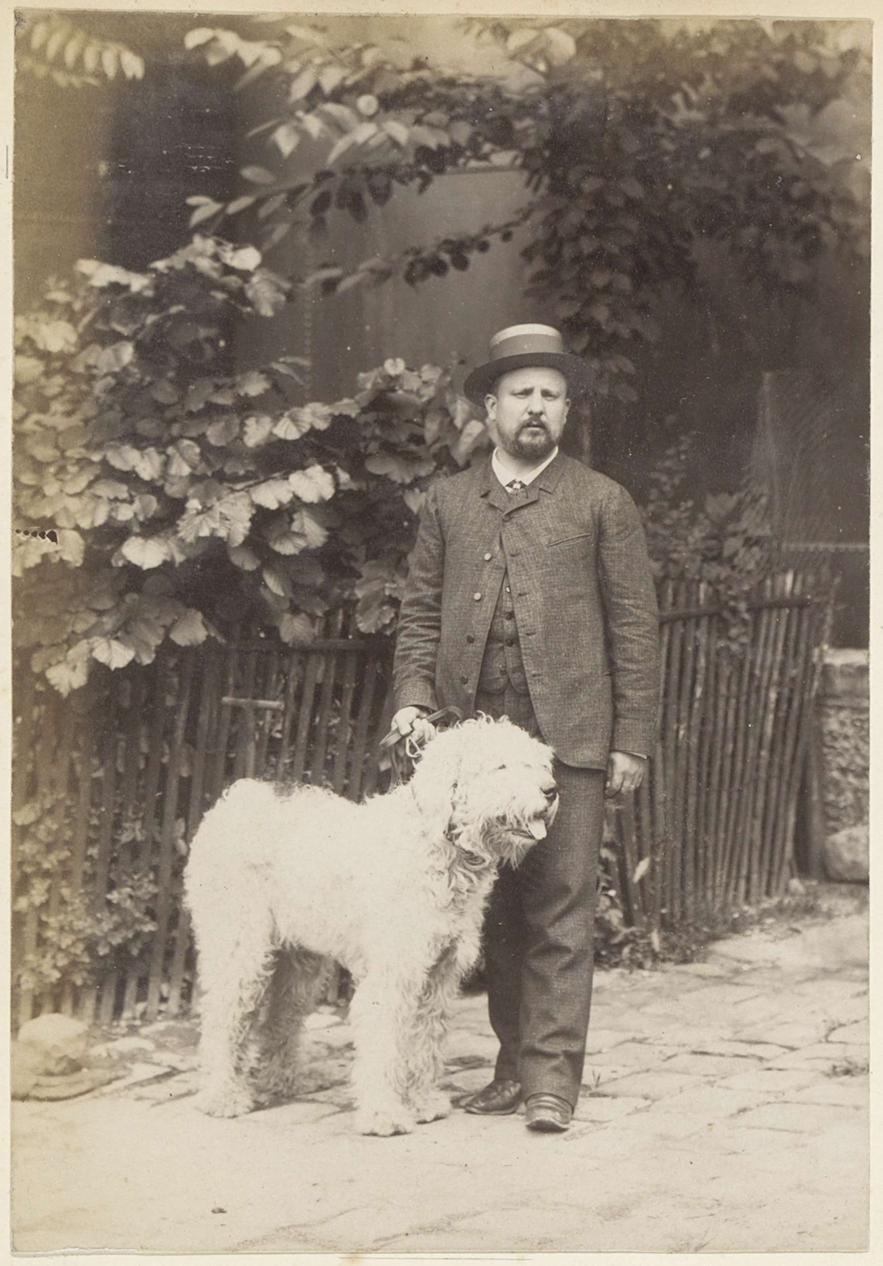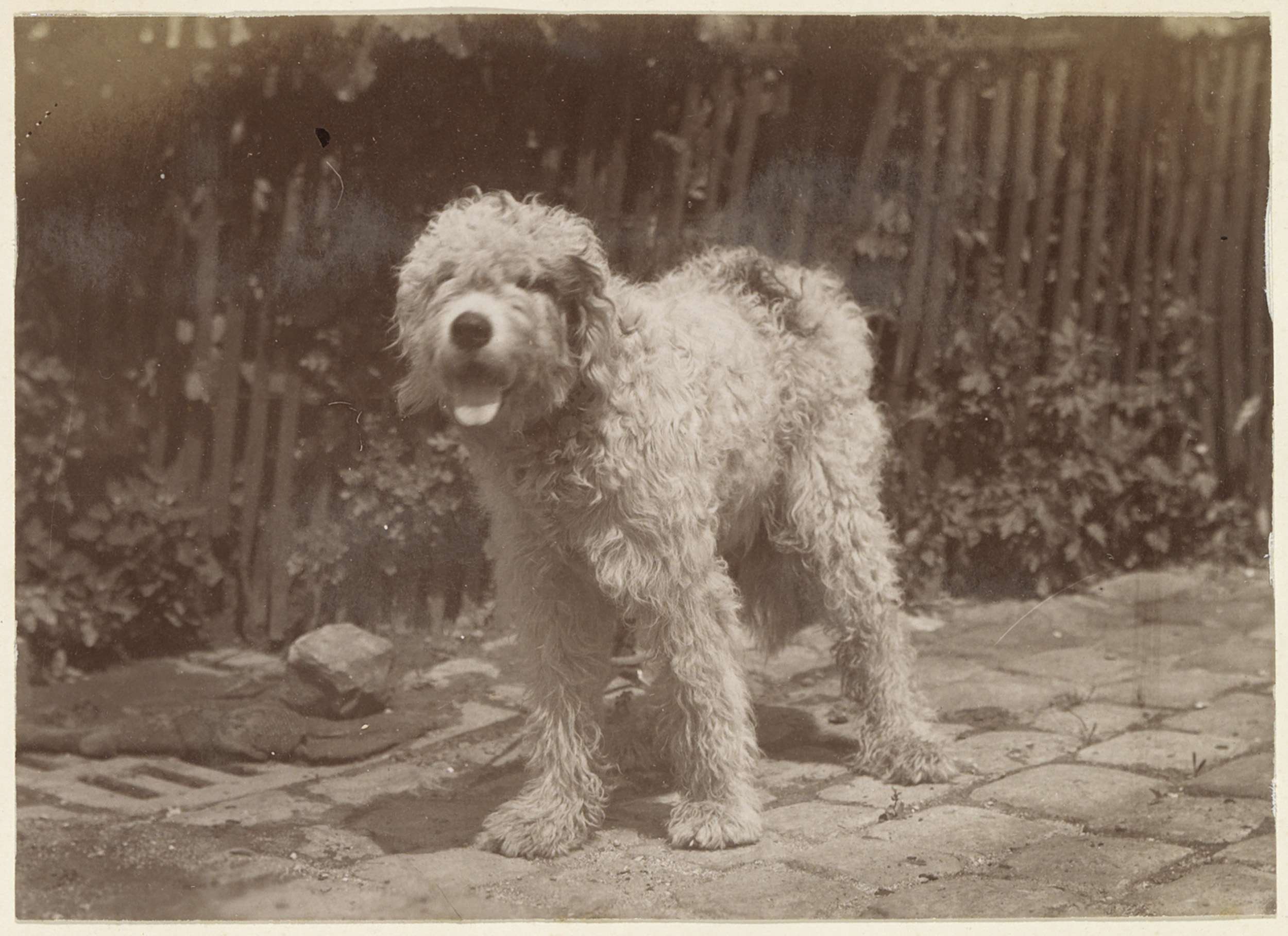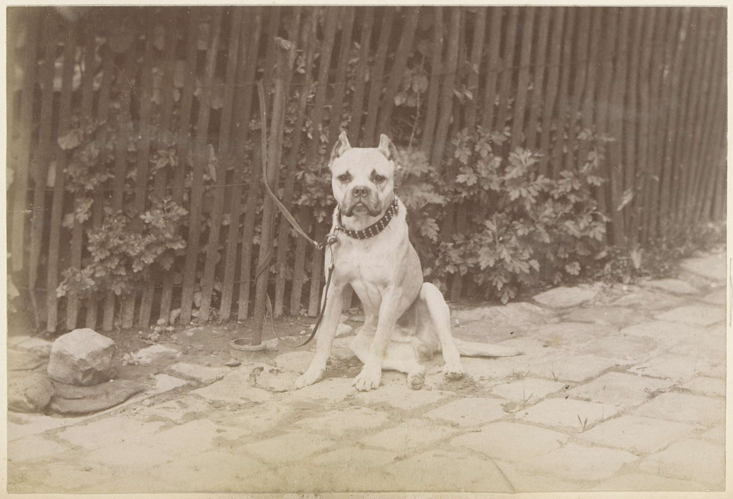 Aangelijnde hond zittend bij een hek in Frankrijk