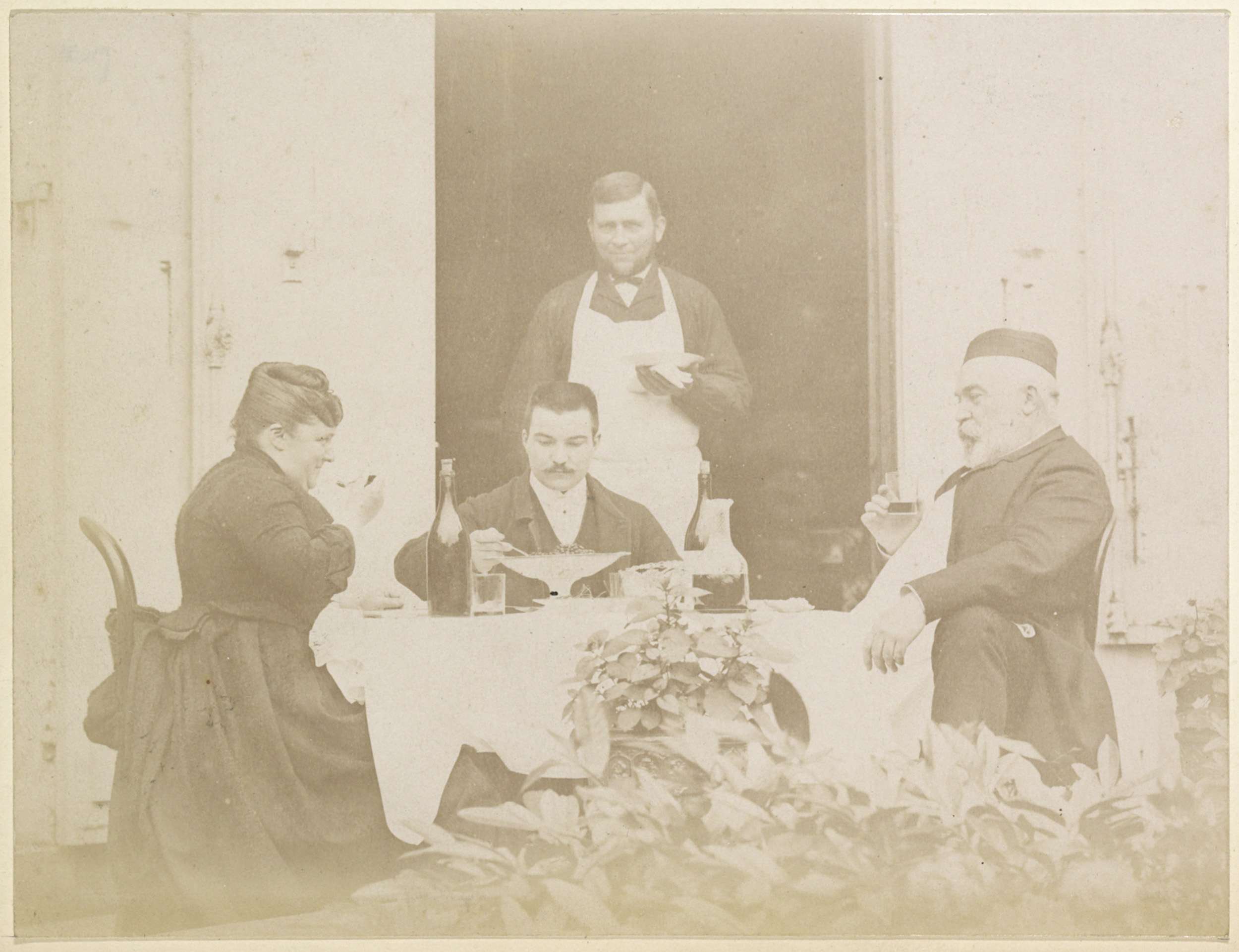 Twee mannen en een vrouw dinerend aan tafel in Frank...