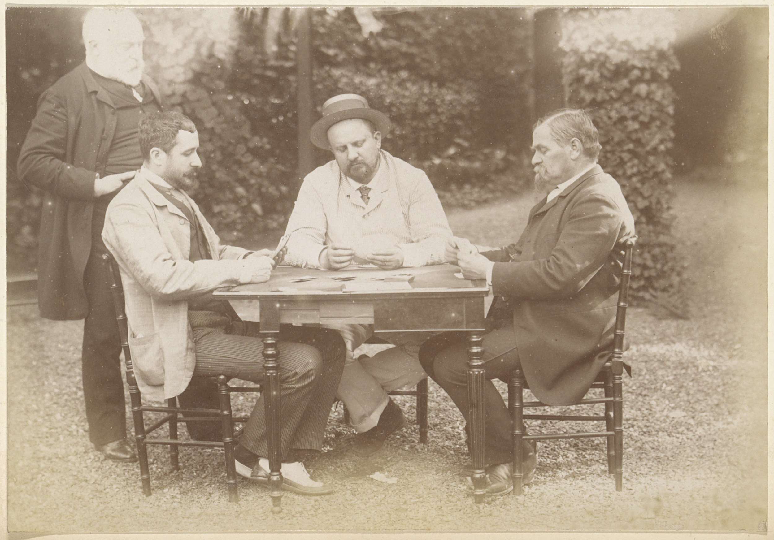 Drie mannen kaartend aan tafel in een tuin in Frankr...