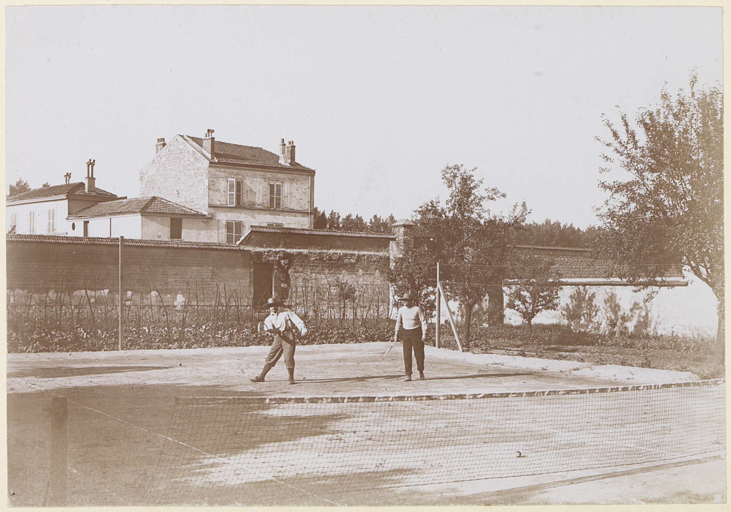 Twee tennisspelers op een ommuurde tennisbaan, vermo...