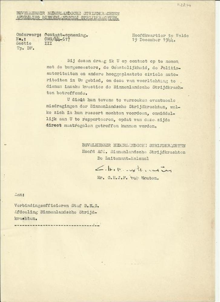 BNS van Houten aan zijn verbindingsofficieren, 19 de...