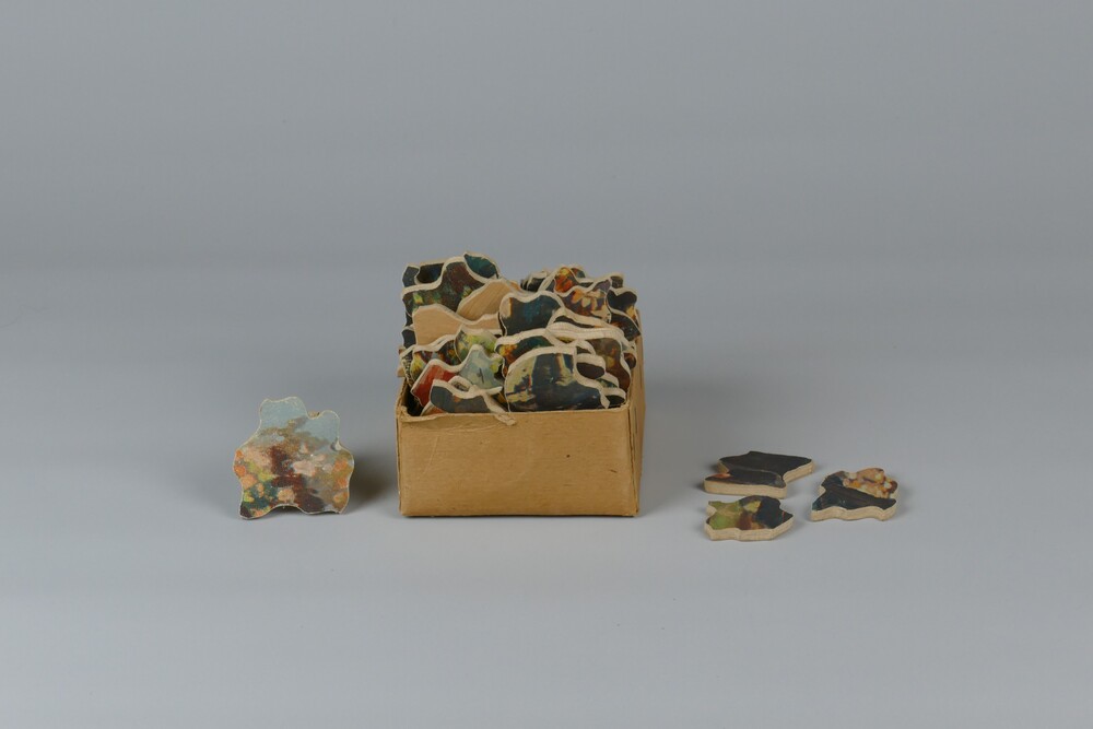 Puzzel van hout met gekleurde opdruk.