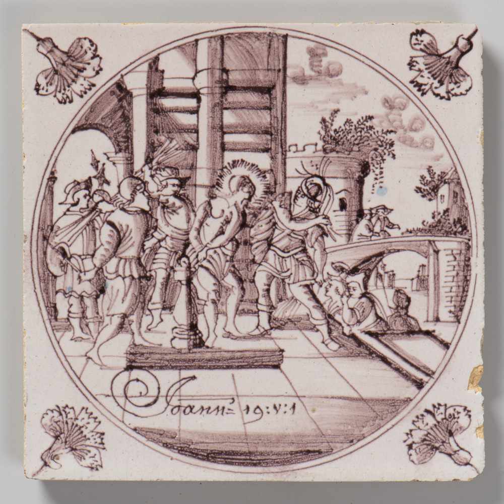 tegel van keramiek met tinglazuur, voorstellende: de...