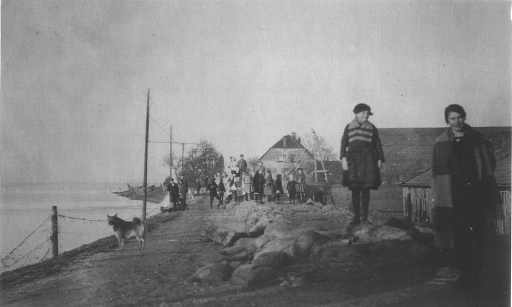 Zwart-wit foto van hoogwater bij de Keiendijk in Tol...