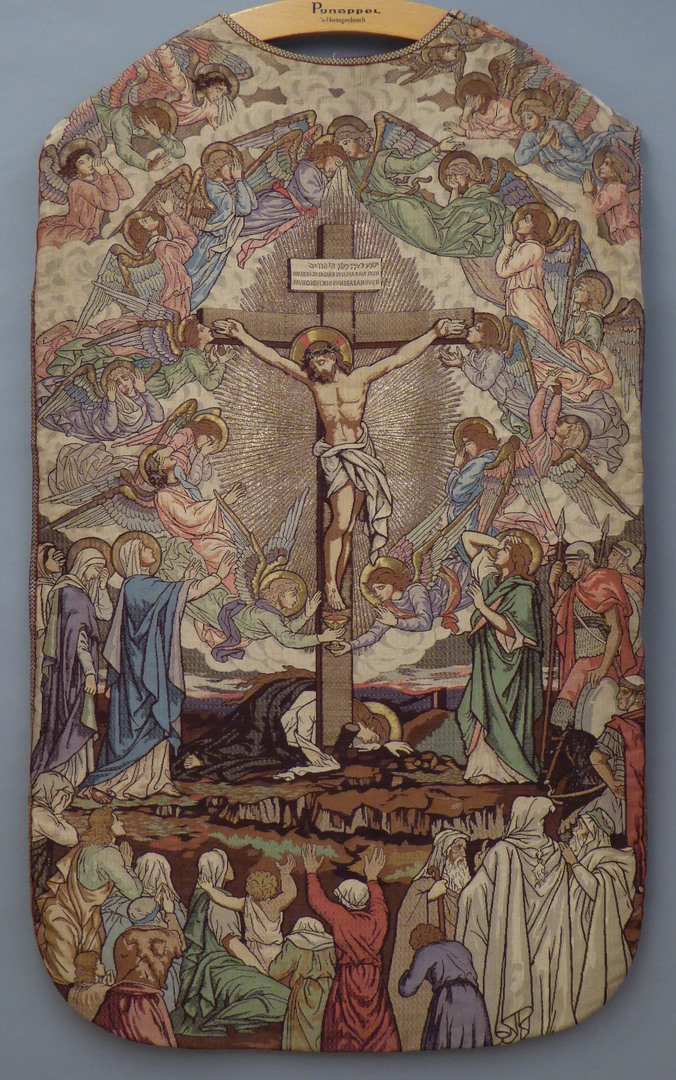 Wit kazuifel met kruisiging en piëta omringd door en...