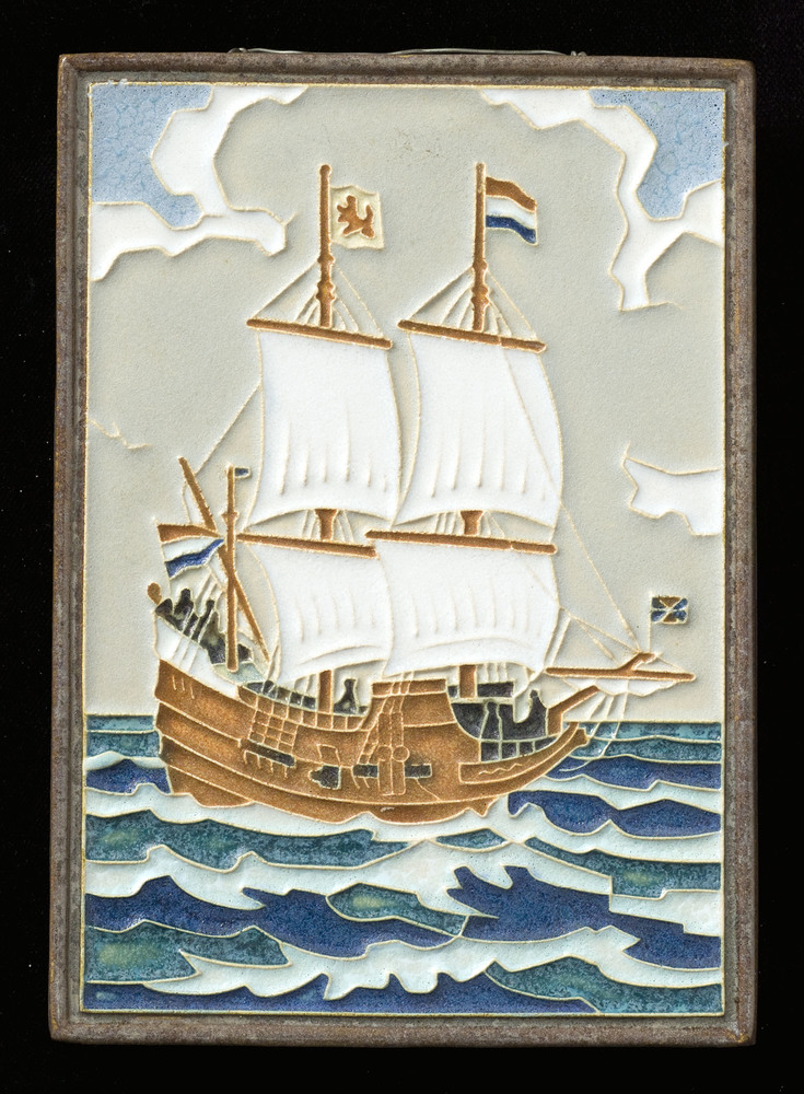 Tegel in cloisonné-techniek, met voorstelling: Schip...