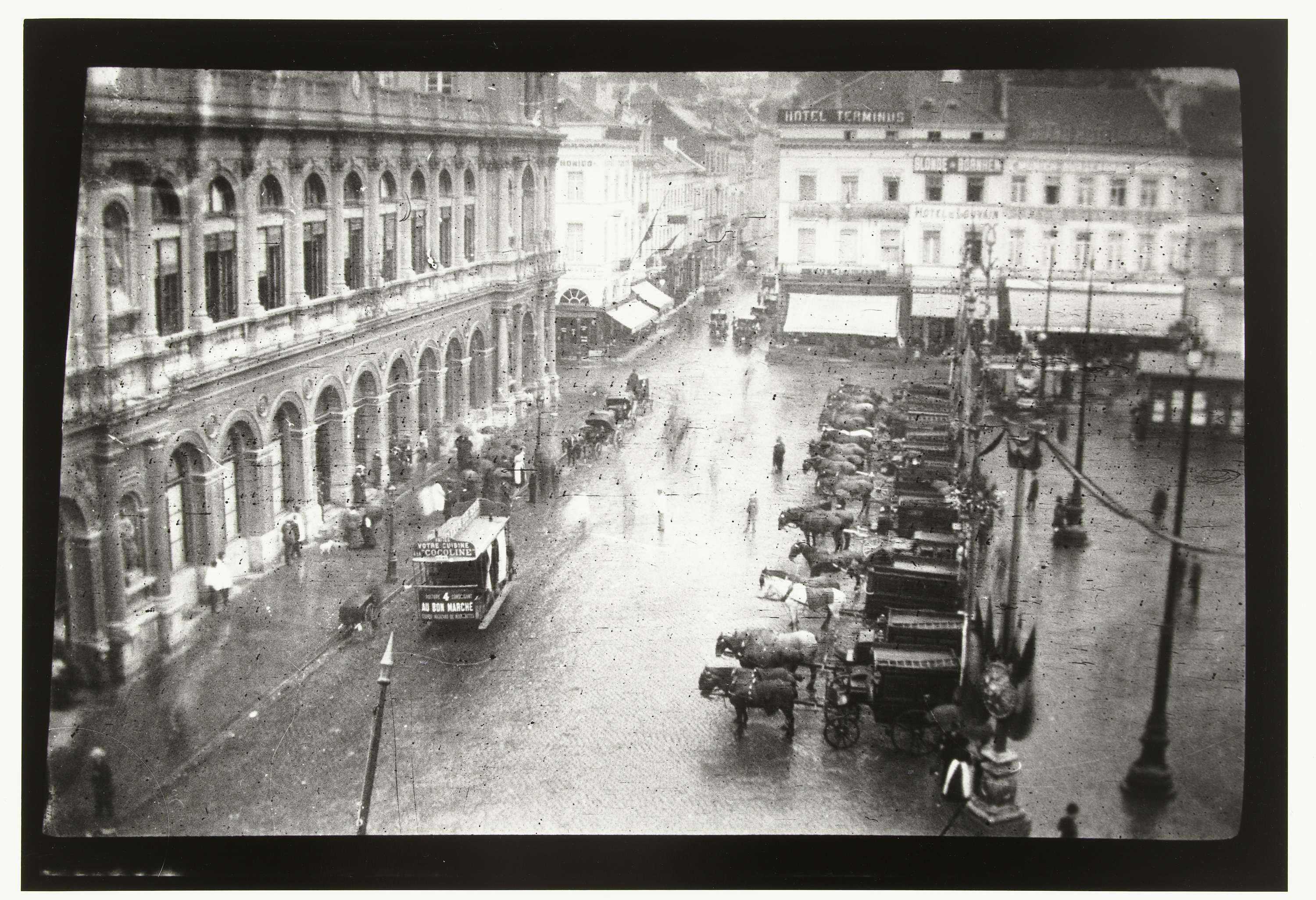 Gezicht op het Leidseplein in Amsterdam met rijtuigv...
