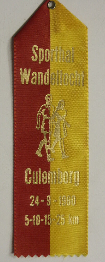 Vaantje van gele en rode kunstzijde met goudkleurige...