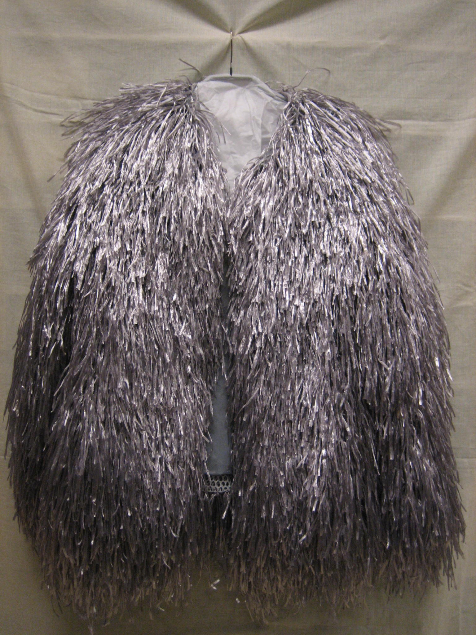 Jasje van grijze wollen crêpe bedekt met open weefse...