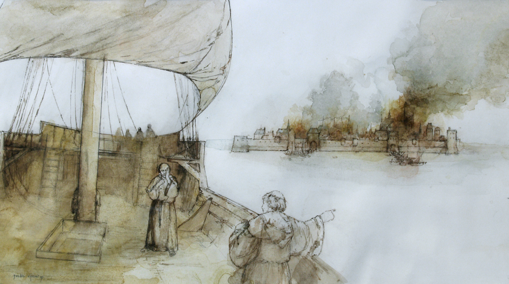 Pater Brugman op een koggeschip tegen de achtergrond...