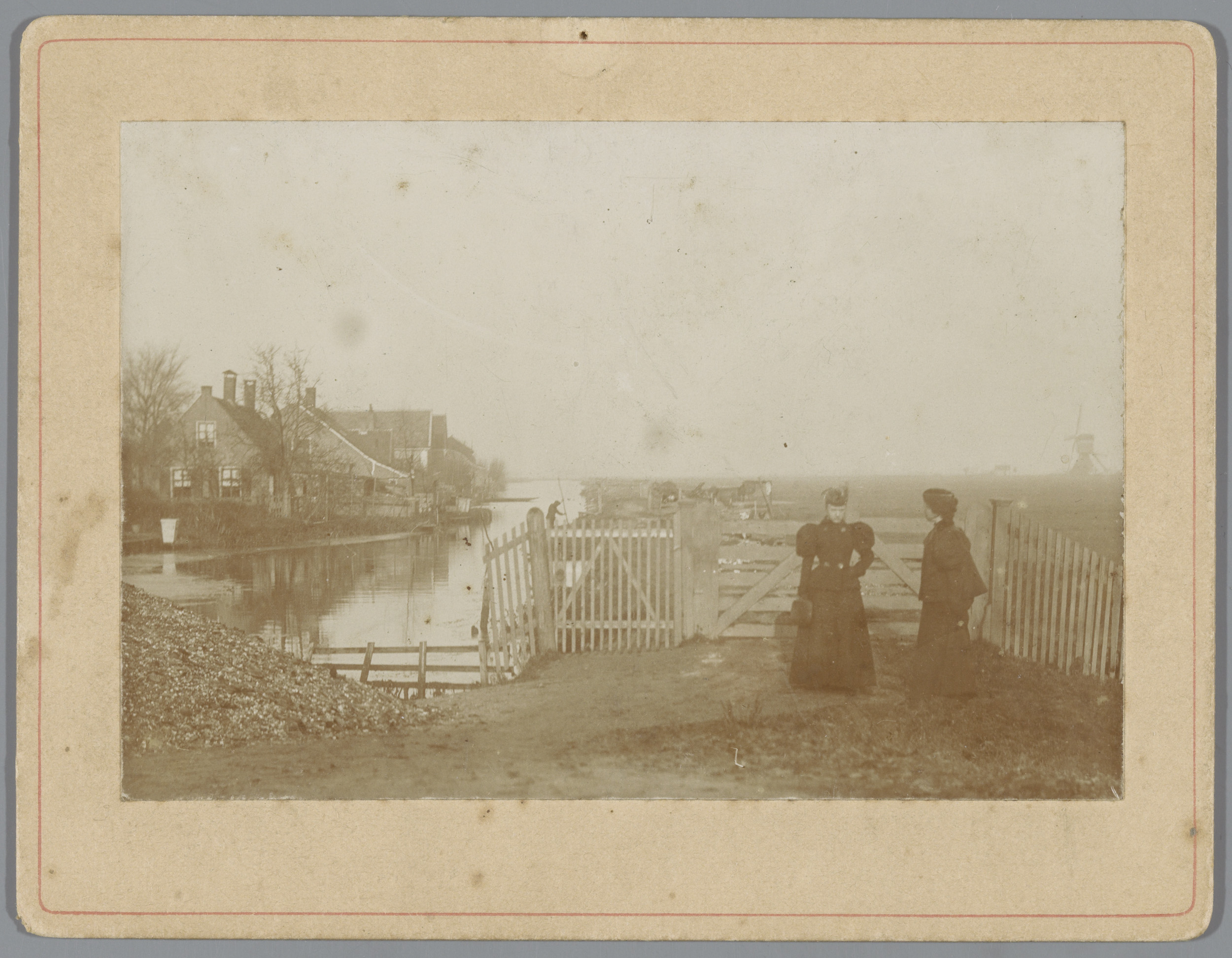 Twee vrouwen voor een hek, met op de achtergrond een...