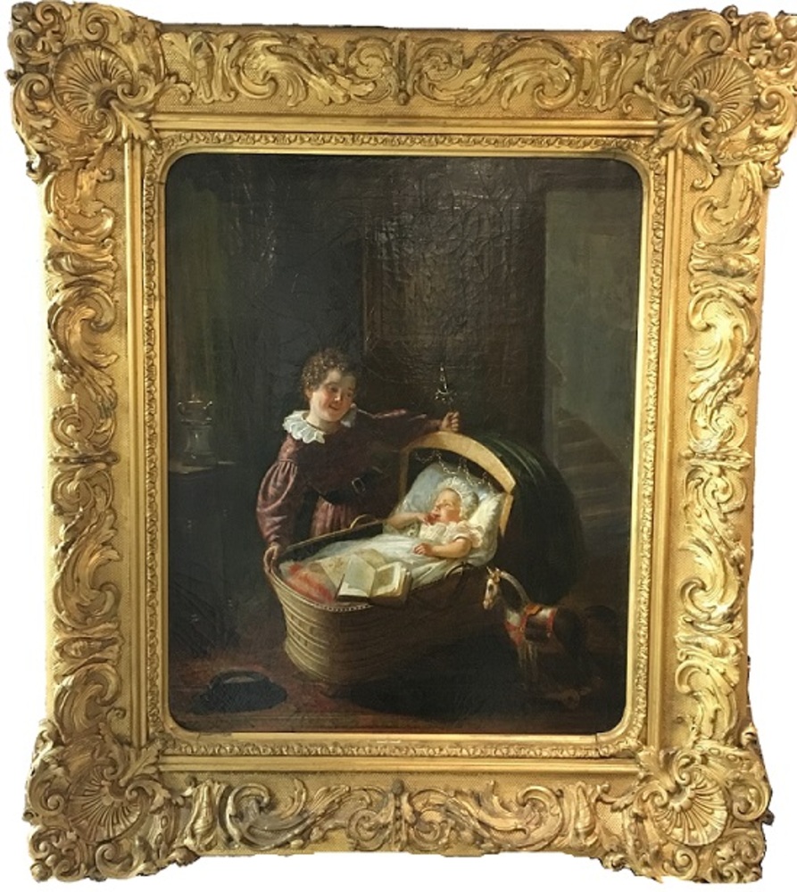 Interieur met baby in wieg en kind dat de wieg schom...