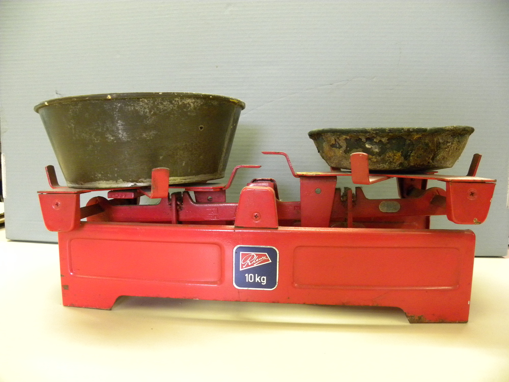 weegschaal met 2 schalen van het merk Rhewa, circa 1950