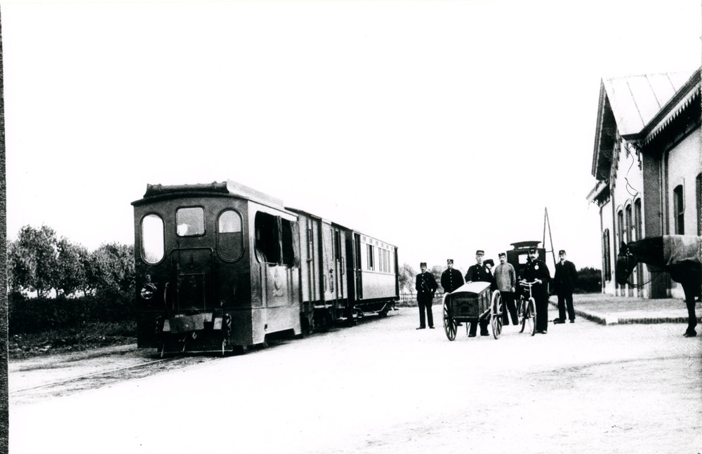 Foto, voorstellende het station met de stoomtram te ...