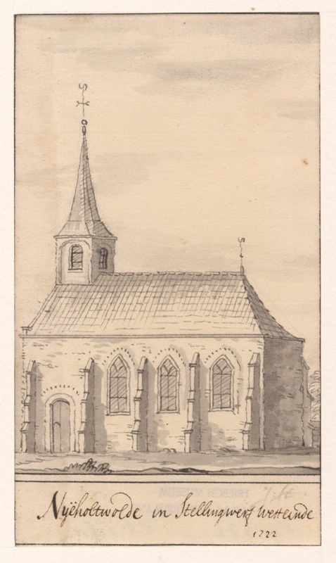 Gezicht op de kerk met spits torentje te Nijeholtwol...