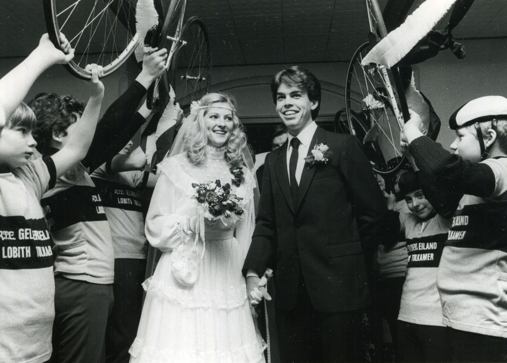 Zwart-wit foto van het huwelijk van Frits van Binsbe...