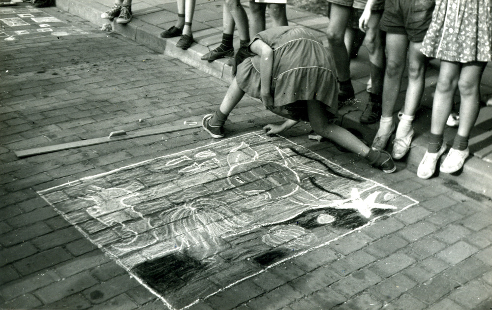 Zwart-wit foto van een straattekenwedstrijd in Lobit...