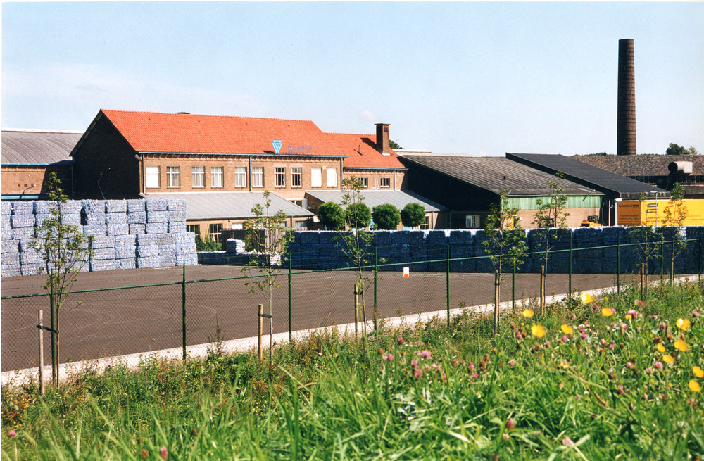 Kleurenfoto van een steenfabriek in Spijk die een an...