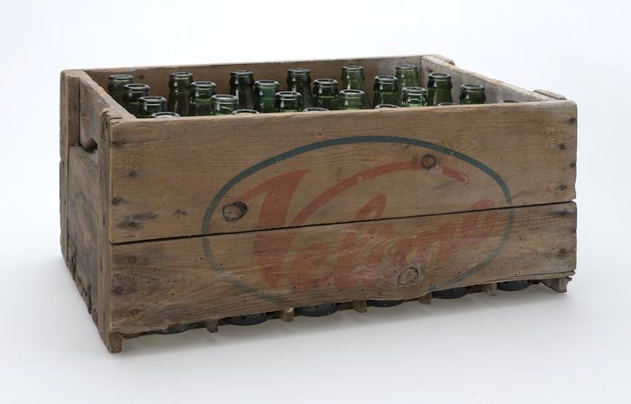 Limonadekrat, gevuld met groene flessen "Velimo, Lim...