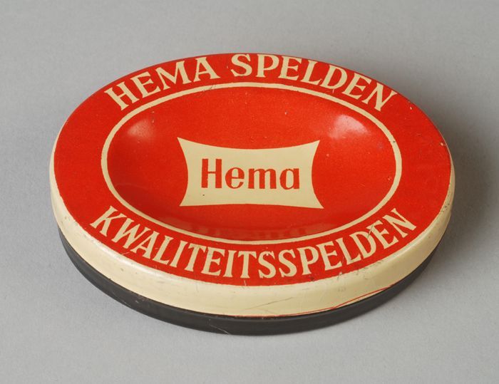 Ovaal rood, wit en zwart blik, "HEMA SPELDEN"
