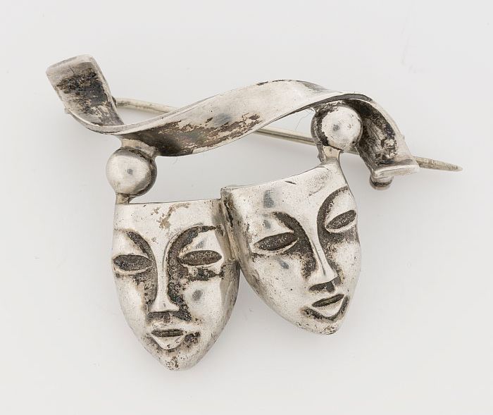 Zilveren broche met twee maskertjes