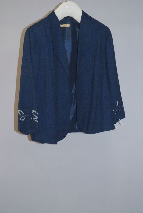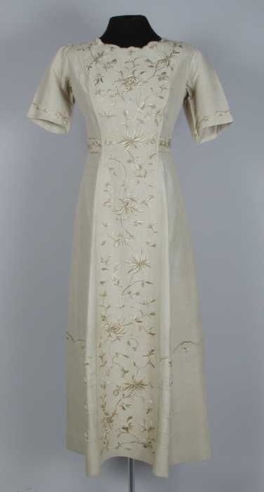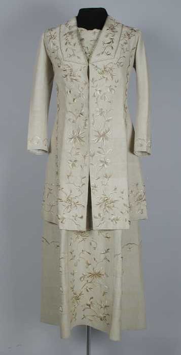 Vierdelig wandelkostuum: mantel van beige zijde met ...