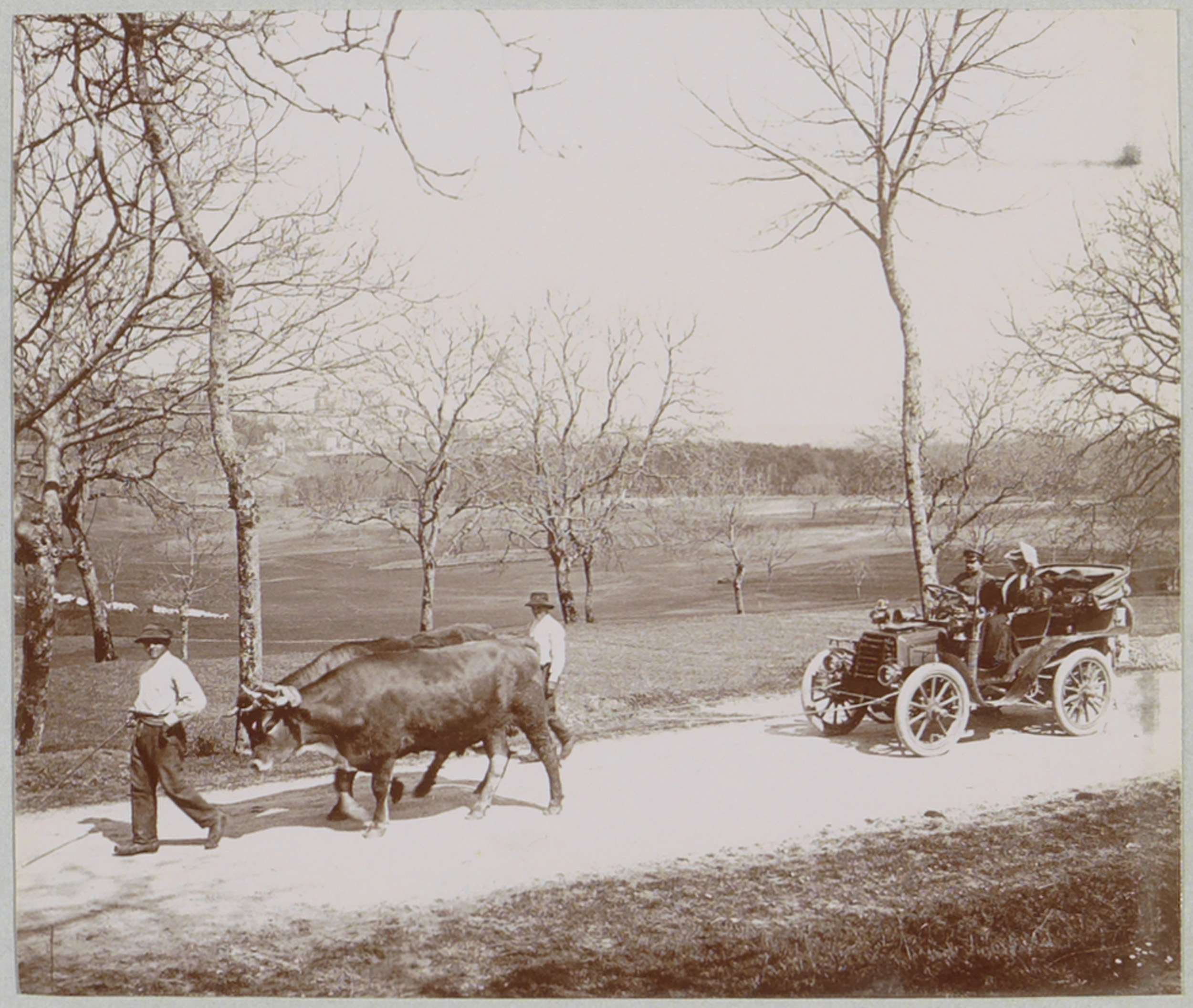 Landweg met ossenkar en boeren, vermoedelijk in Spaa...