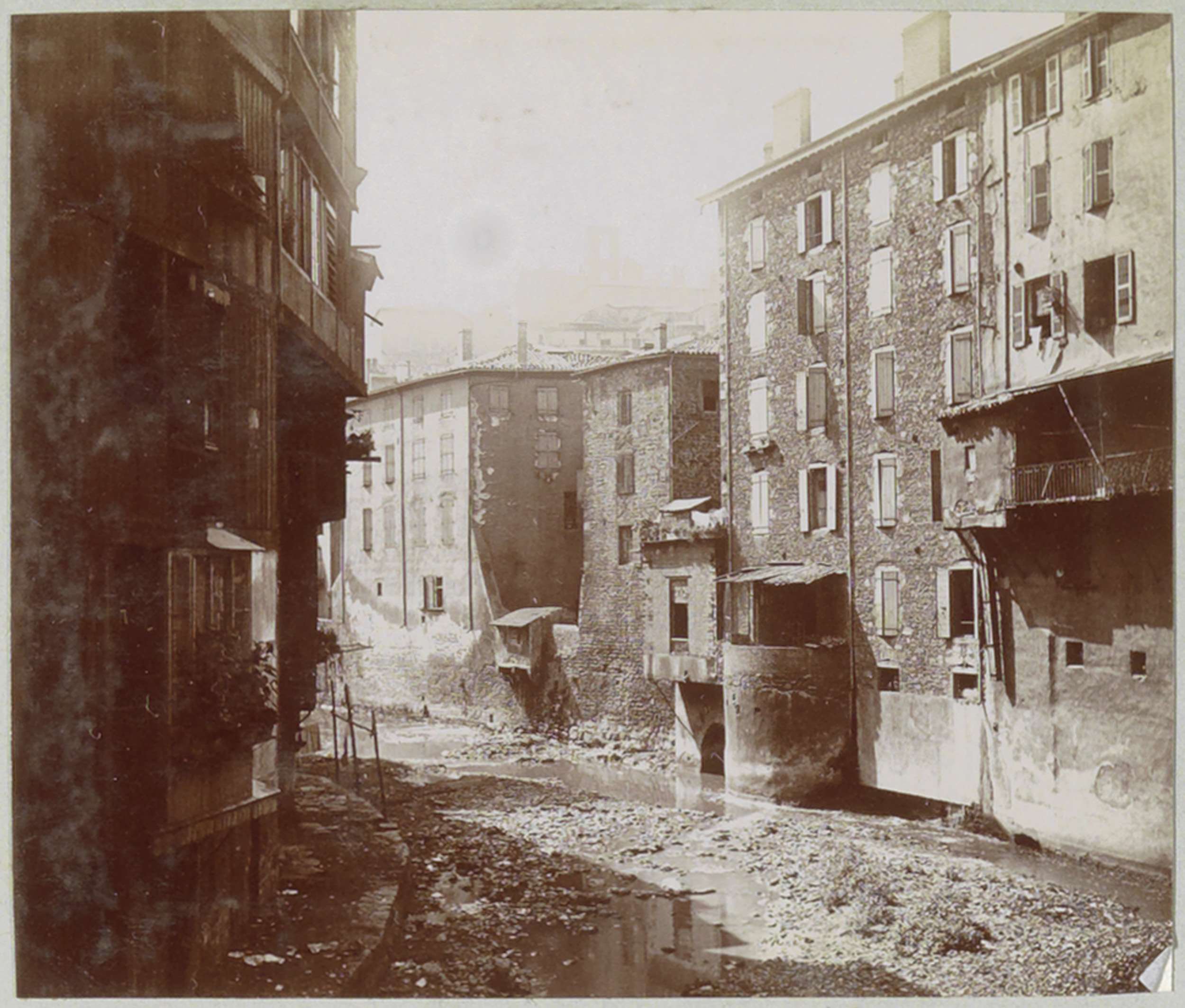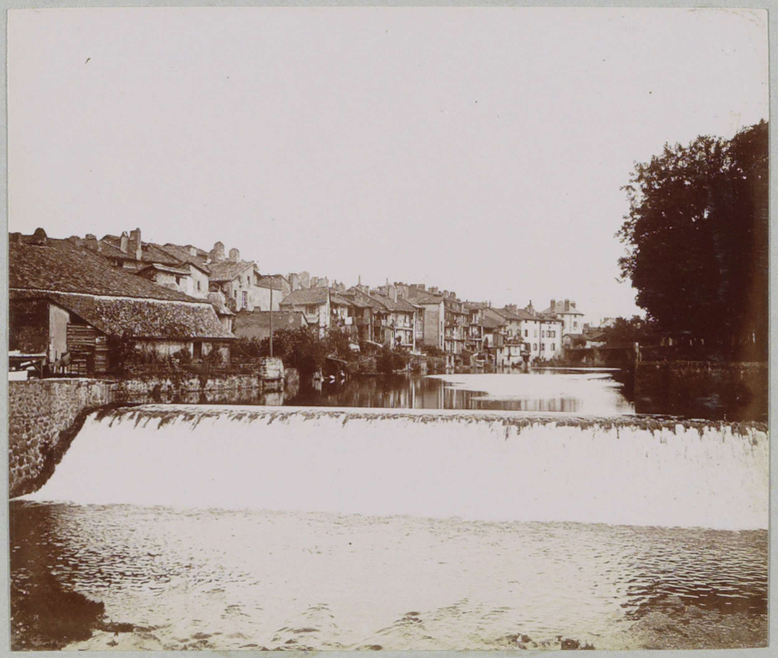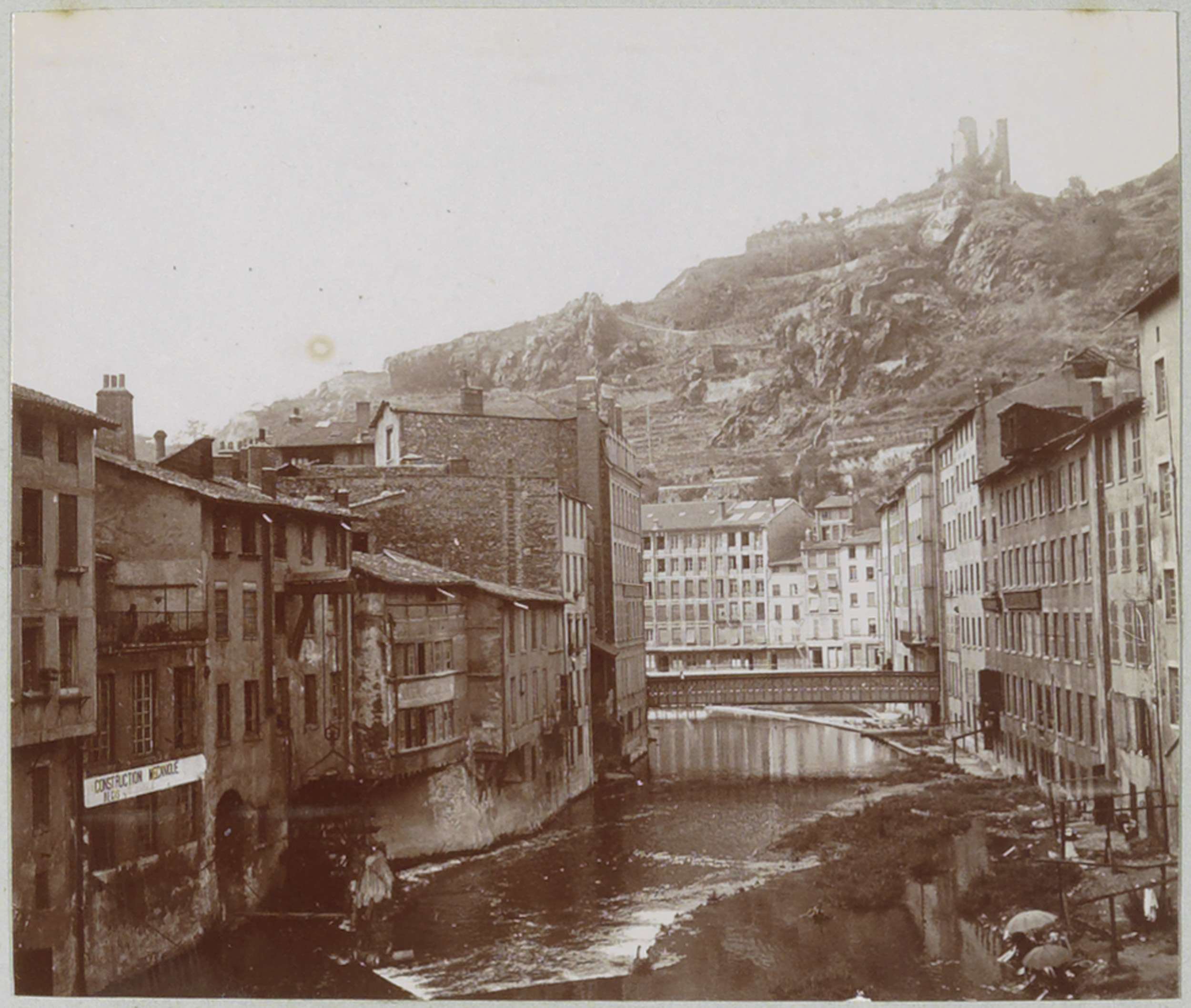 Gezicht op Vienne met huizen langs een rivier en (re...