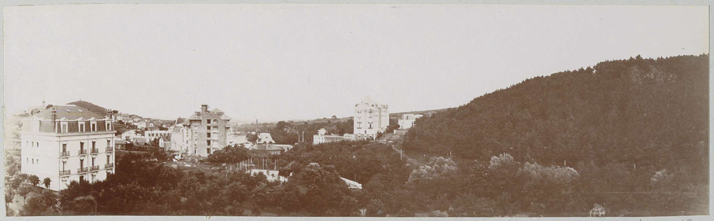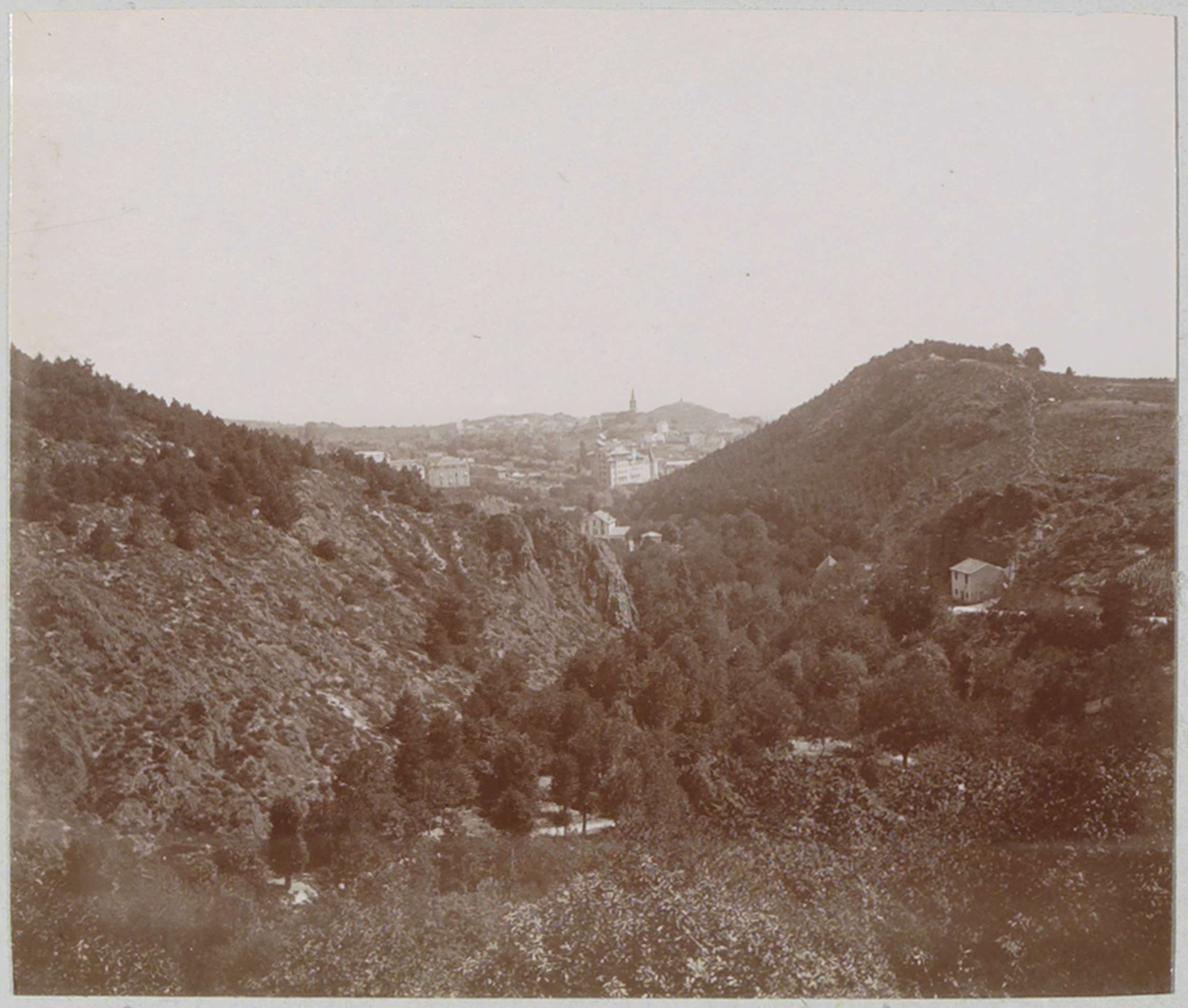 Gezicht op Châtel-Guyon over beboste berghellingen