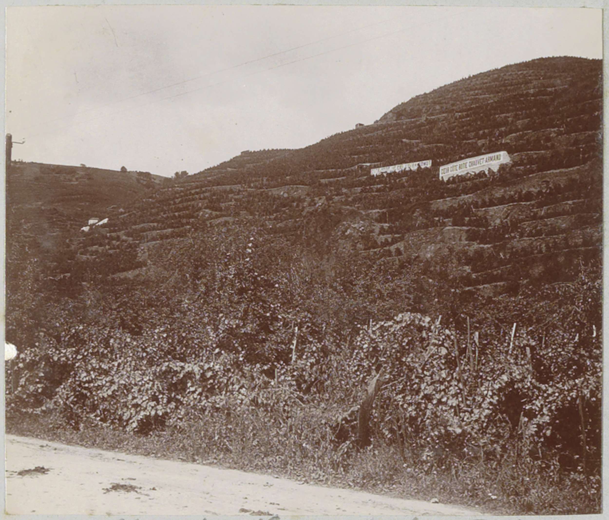 Hellingen met wijngaarden en reclameborden van de Cô...