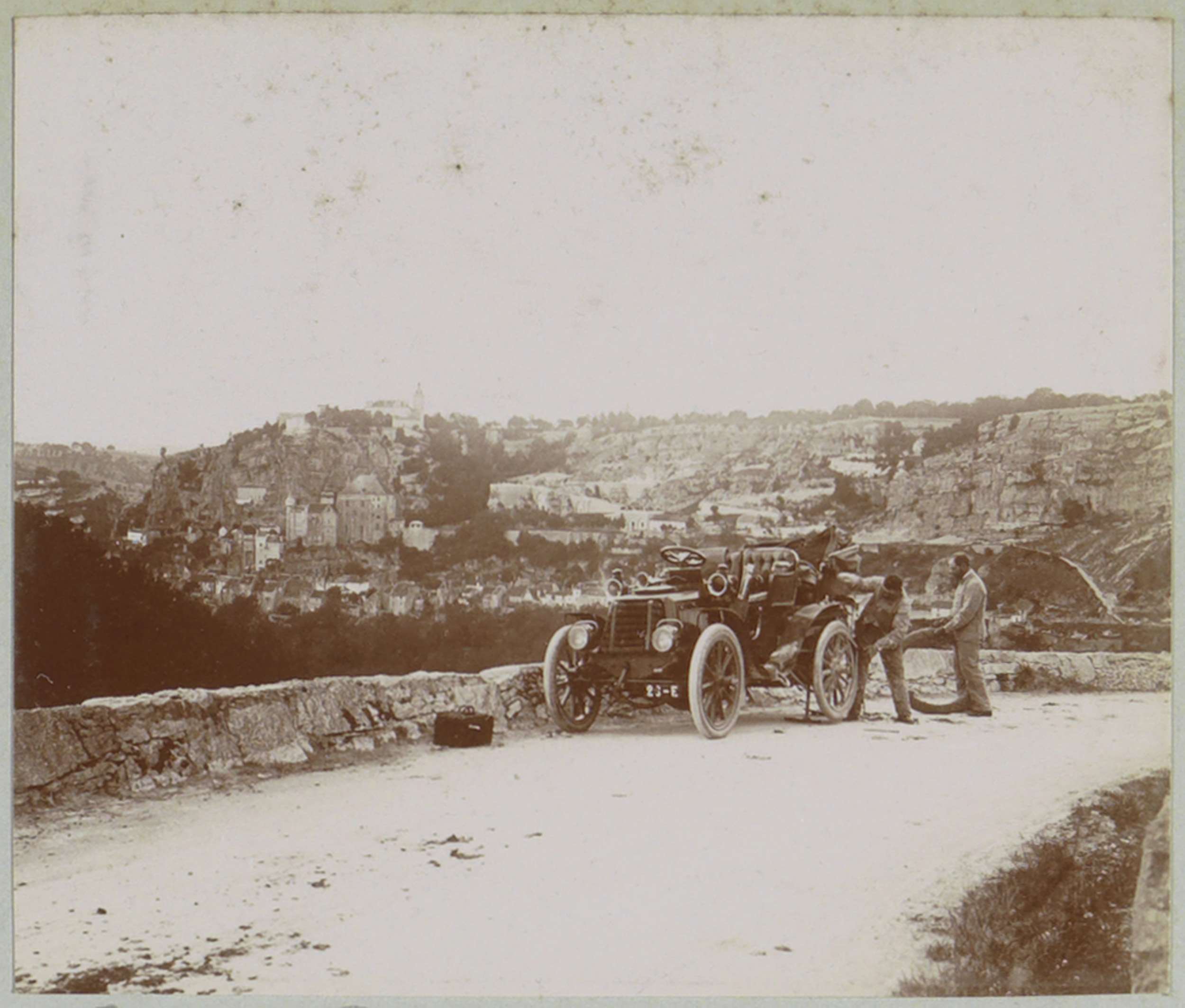 Bandenwissel van automobiel op een weg bij Rocamadour
