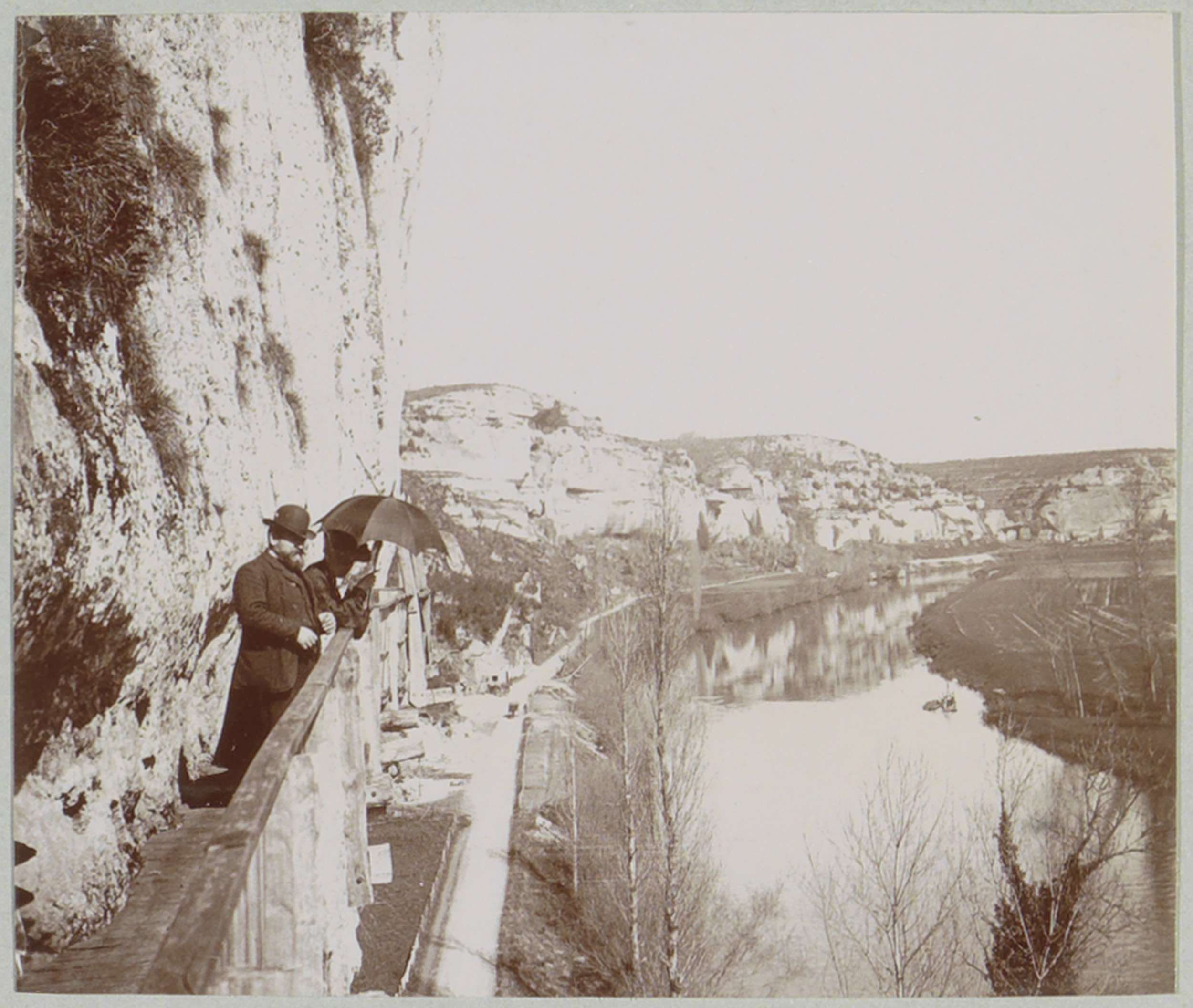 Vrouw op een pad langs een rotswand bij Les Eyzies-d...