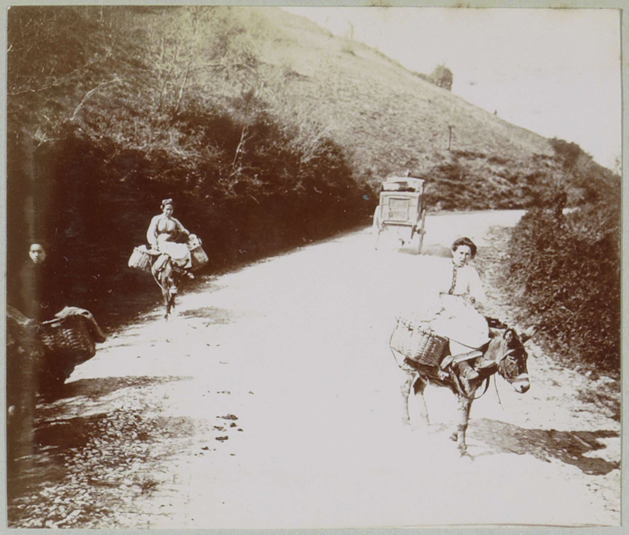Landweg met vrouwen op ezels en een kar, vermoedelij...