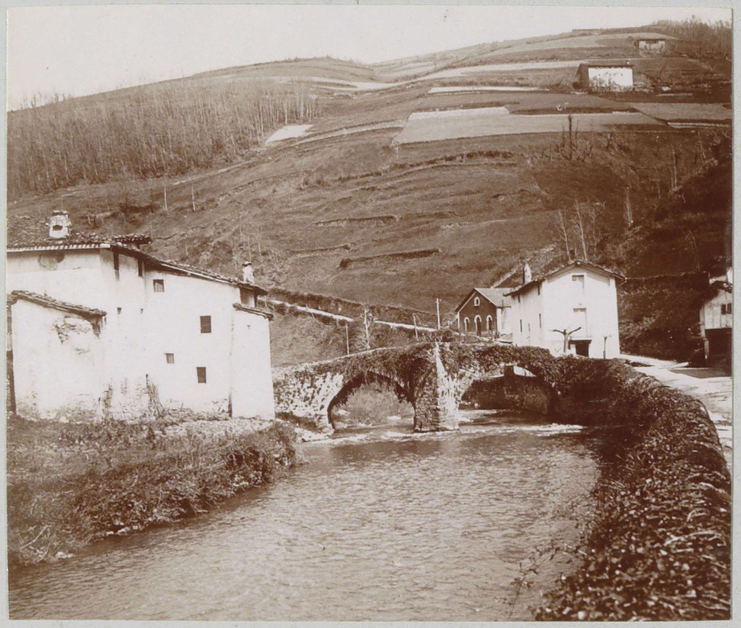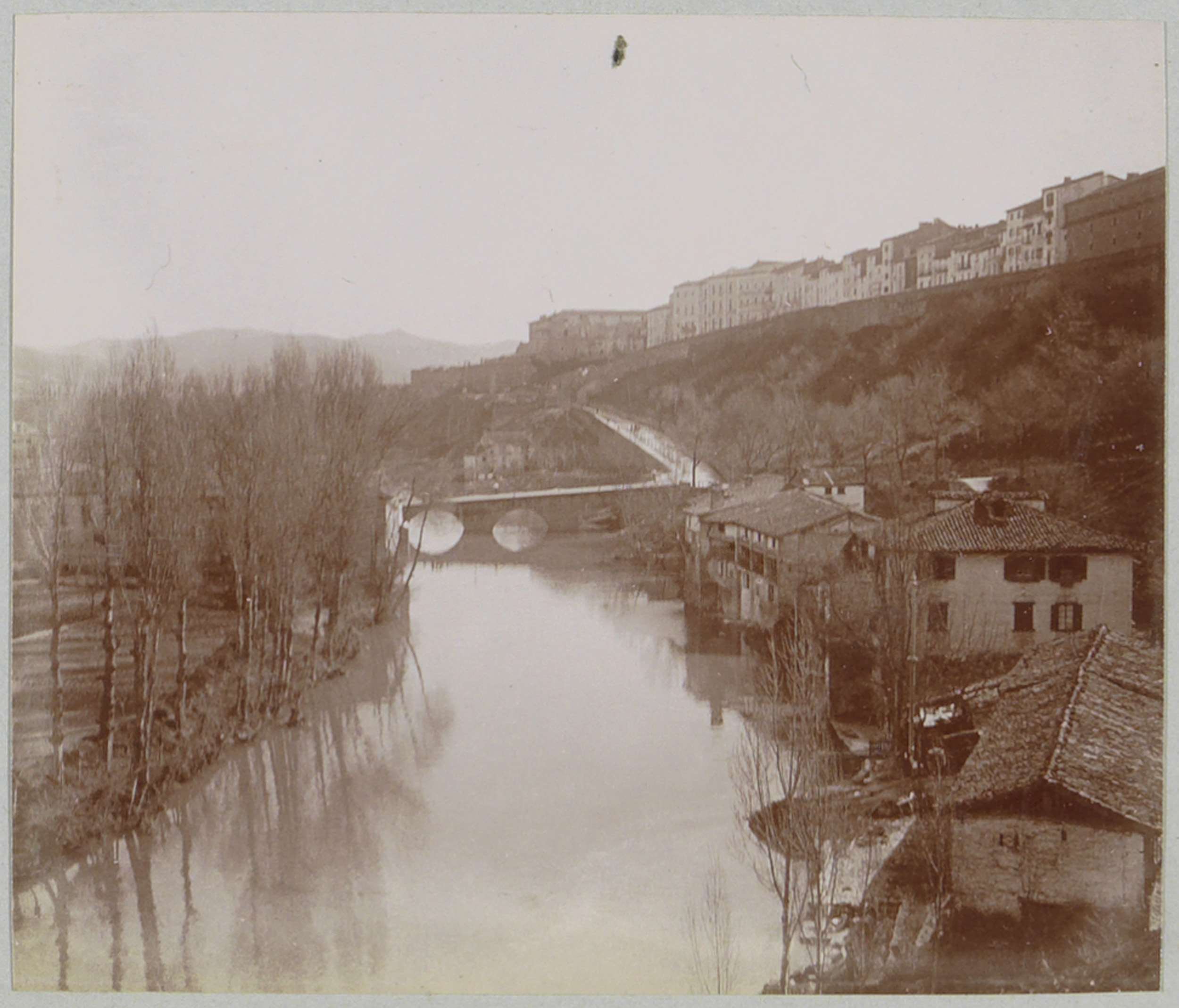 Rivier met brug en huizen, vermoedelijk in Spaans Ba...