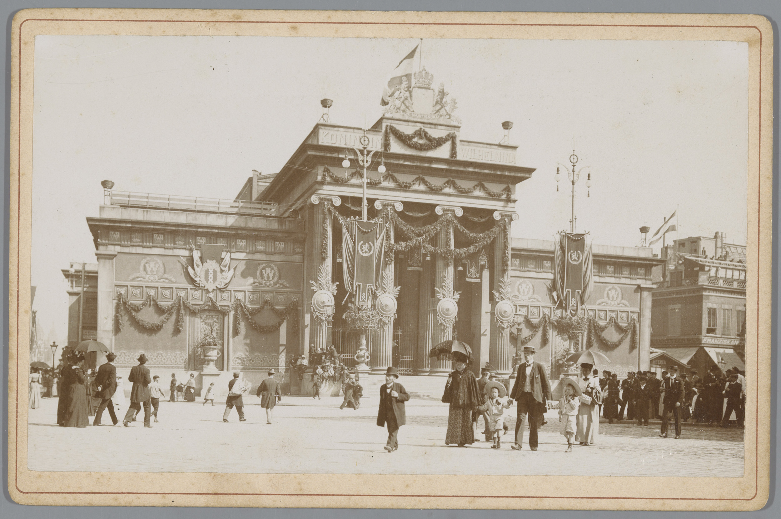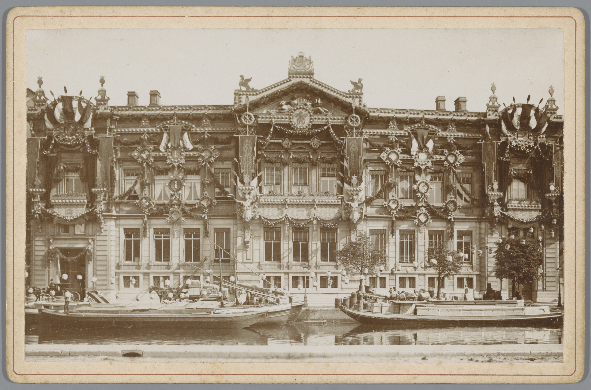 Gezicht op de Beurs van Zocher tijdens de inhuldigin...