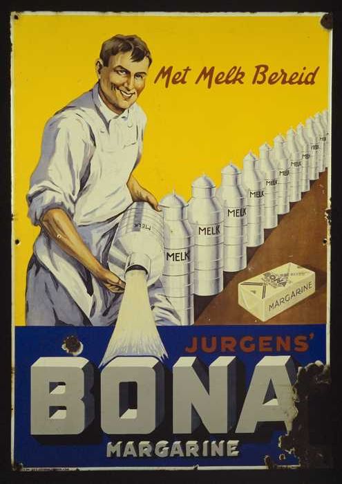 Geel reclamebord met "Jurgens Bona Margarine", "Met ...