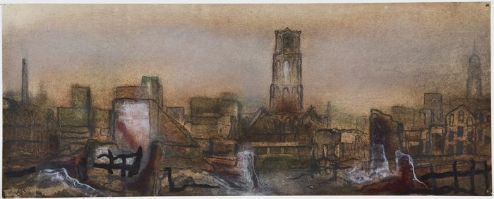 Ingekleurde tekening: panorama van de verwoeste stad...