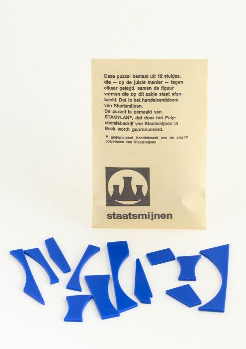 Blauwe puzzel "staatsmijnen" in wit zakje met zwarte...
